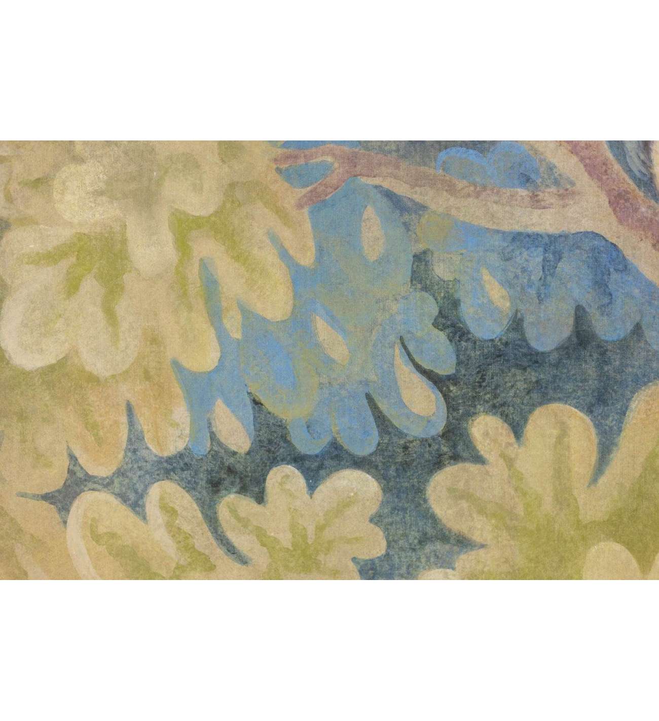 Raw linen canvas hand painted with natural pigments and golden patterns made with copper leaf. Canvas stretched using two wooden sticks, the bottom one of which is removable, allowing it to be rolled up for transport.