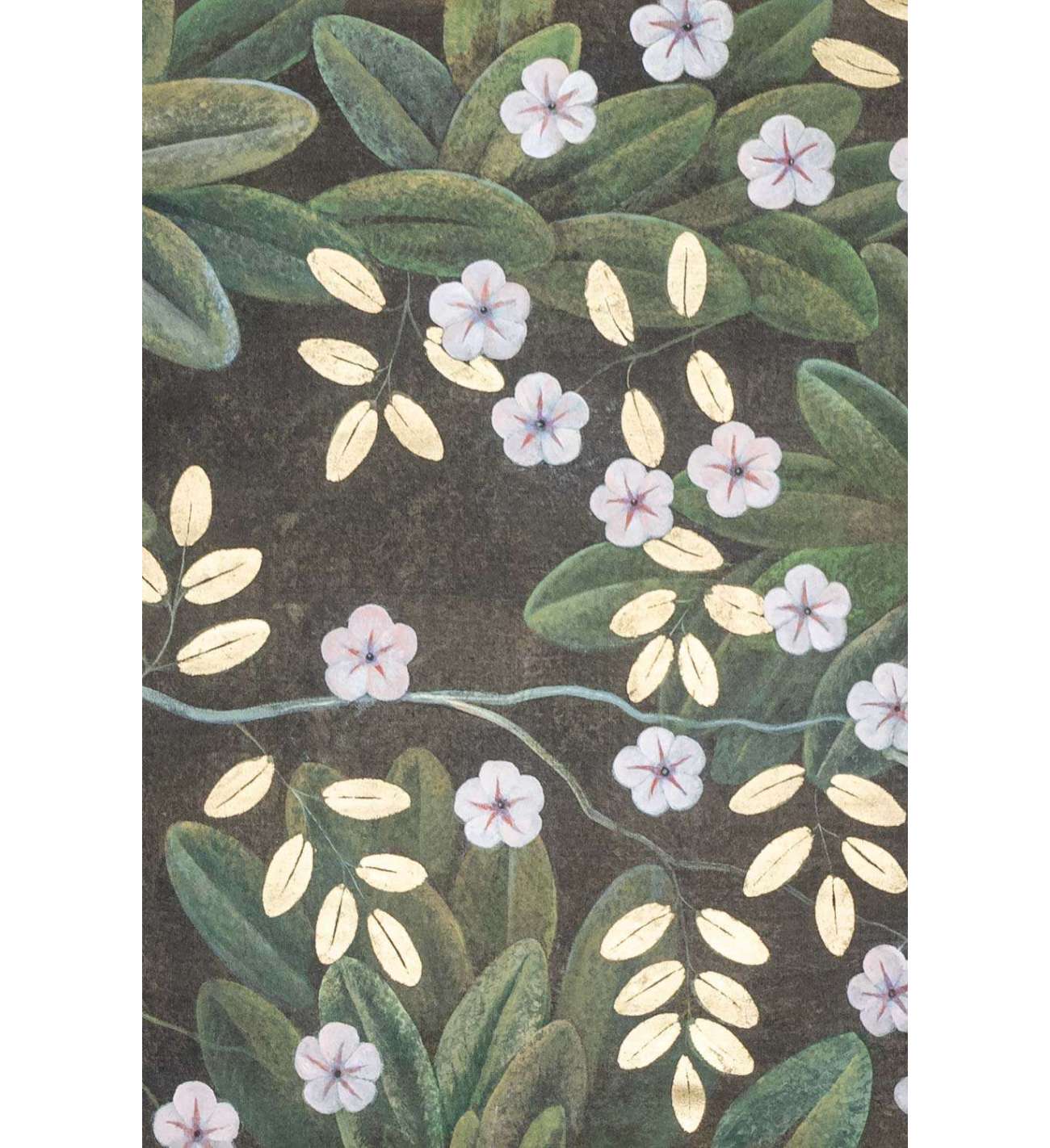 Raw linen canvas hand painted with natural pigments and golden patterns made with copper leaf. Canvas stretched using two wooden sticks, the bottom one of which is removable, allowing it to be rolled up for transport.