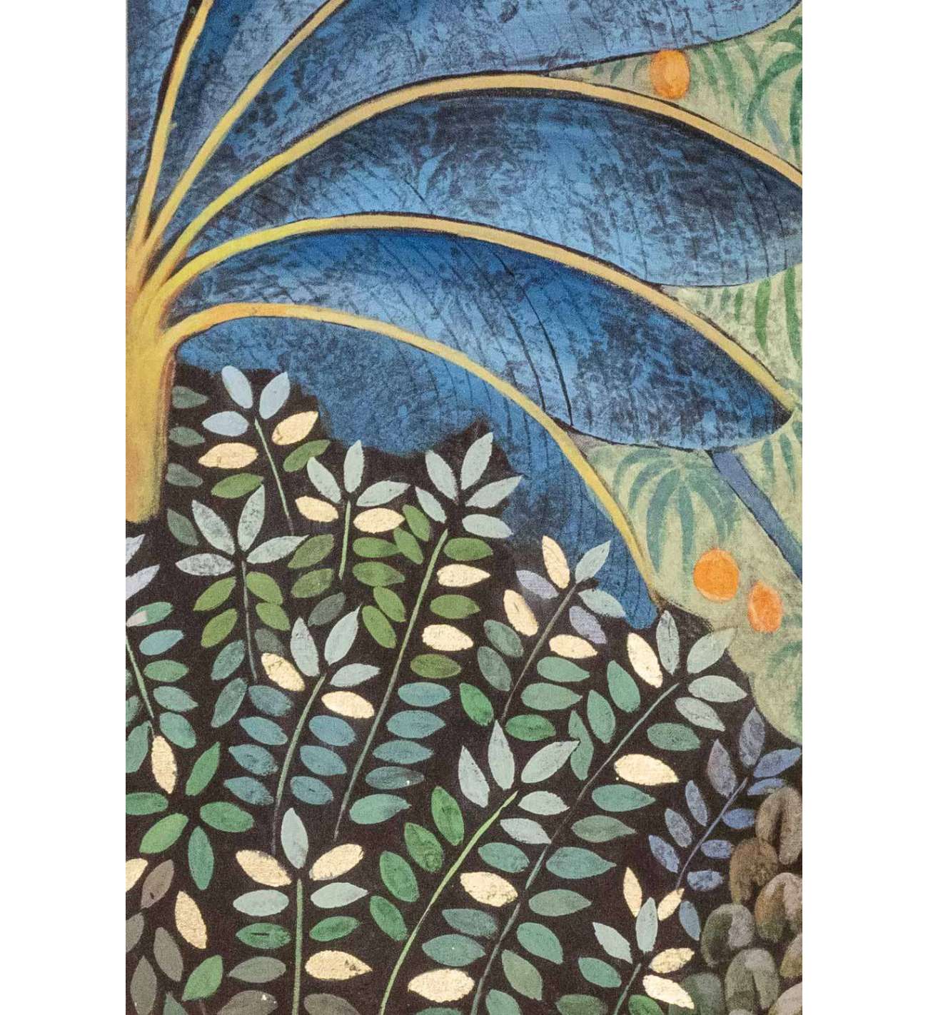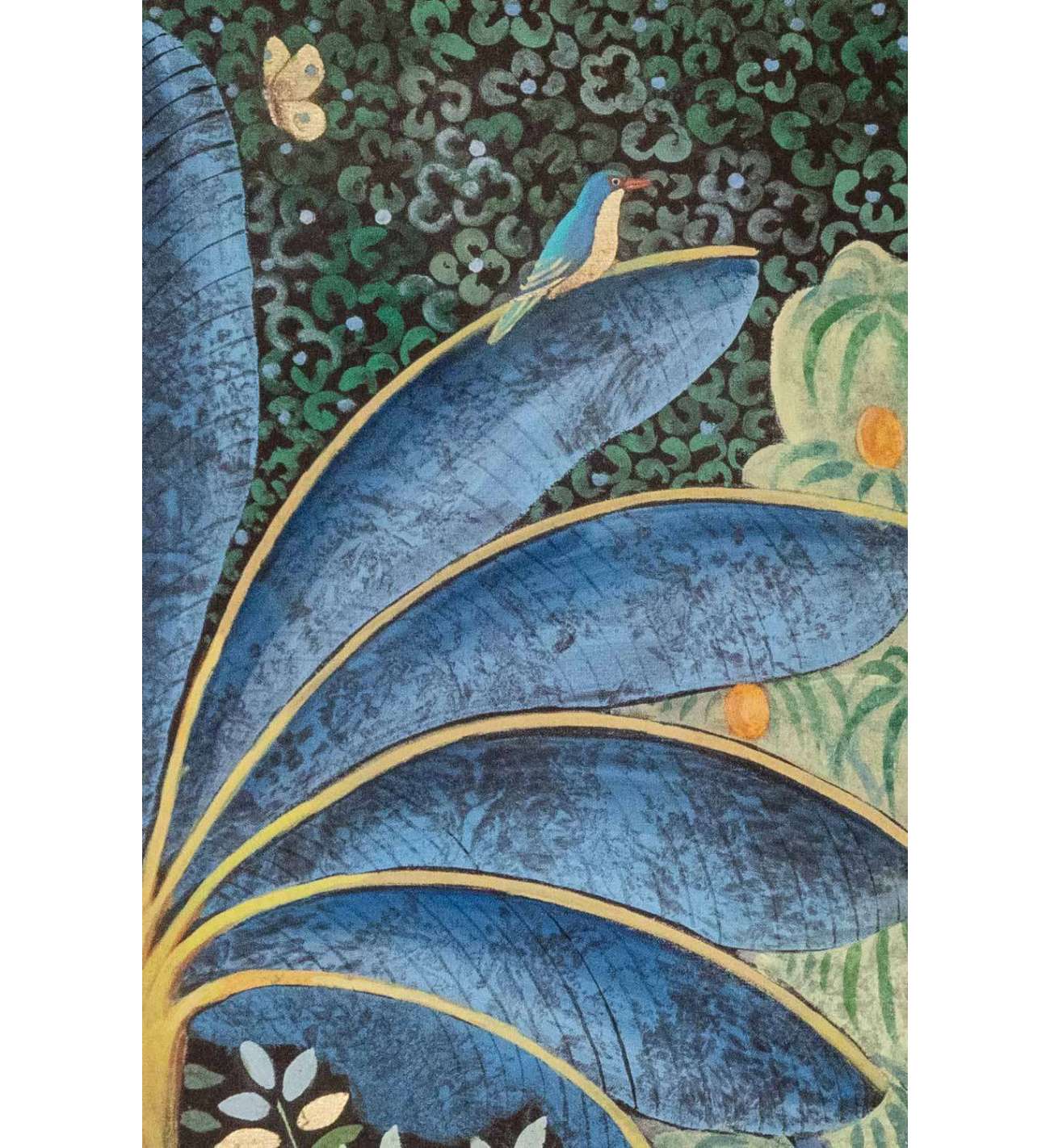 There are no more items in your cartPainted canvas representing monkeys on a fruit tree and a bird on the leaf of a stylized blue palm tree.