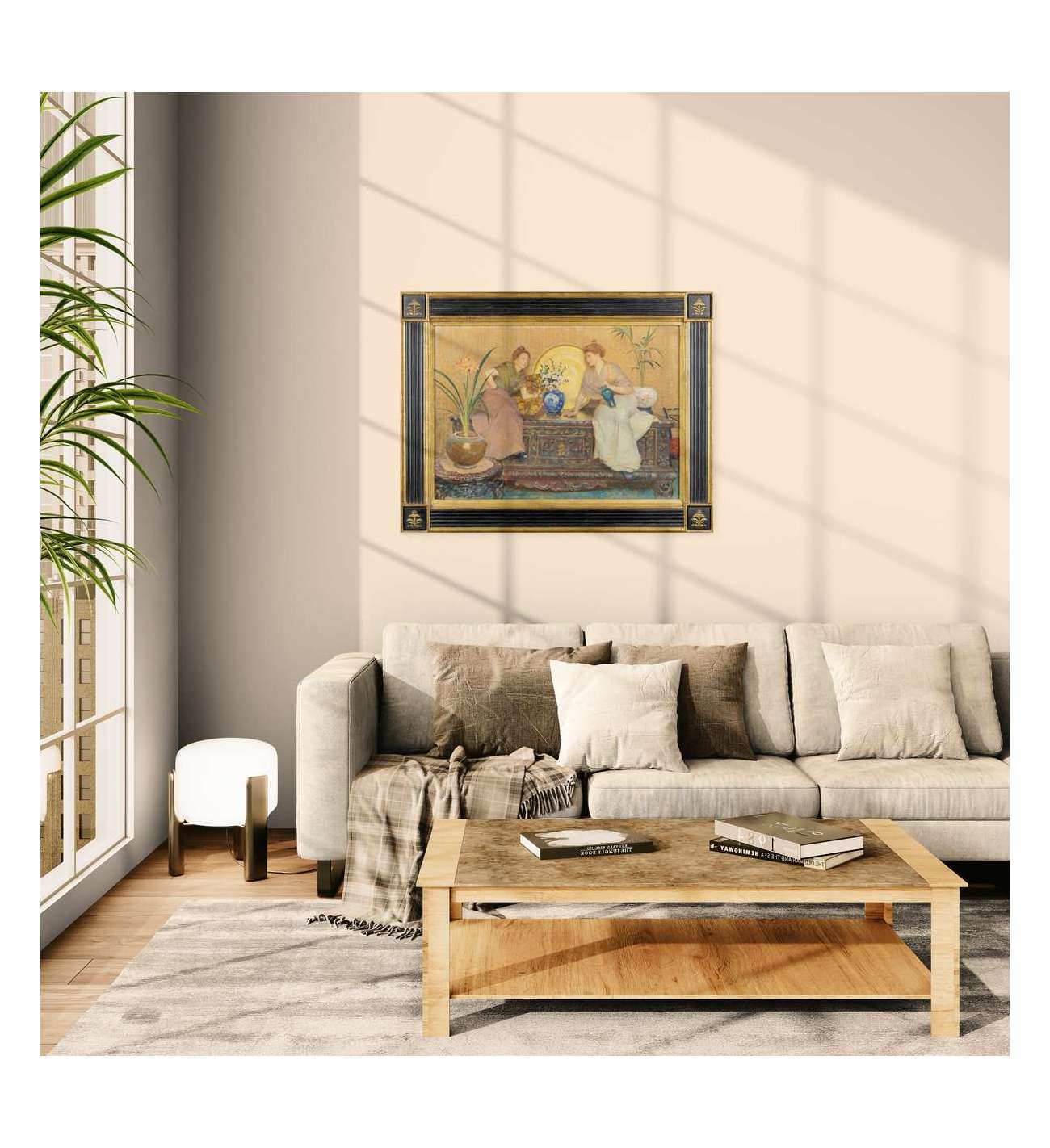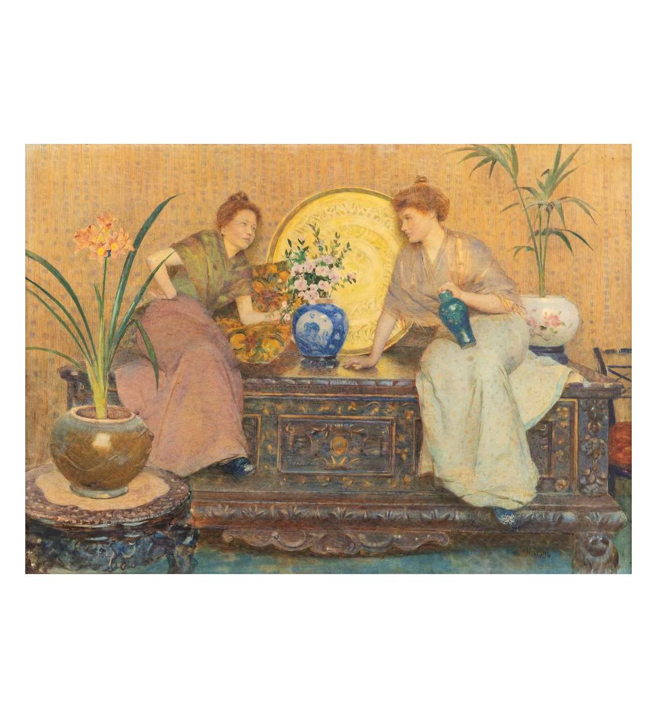 In Whispers and Porcelain, Hector Caffieri unveils an intimate world of silence, beauty, and refinement. Two young women inhabit a richly decorated interior, surrounded by houseplants, a Chinese chest, and a radiant yellow wall plate anchoring the composition. The atmosphere recalls the sensibility of Dante Gabriel Rossetti, while the painting also bears witness to the academic precision Caffieri inherited from Lefebvre and Bonnat.