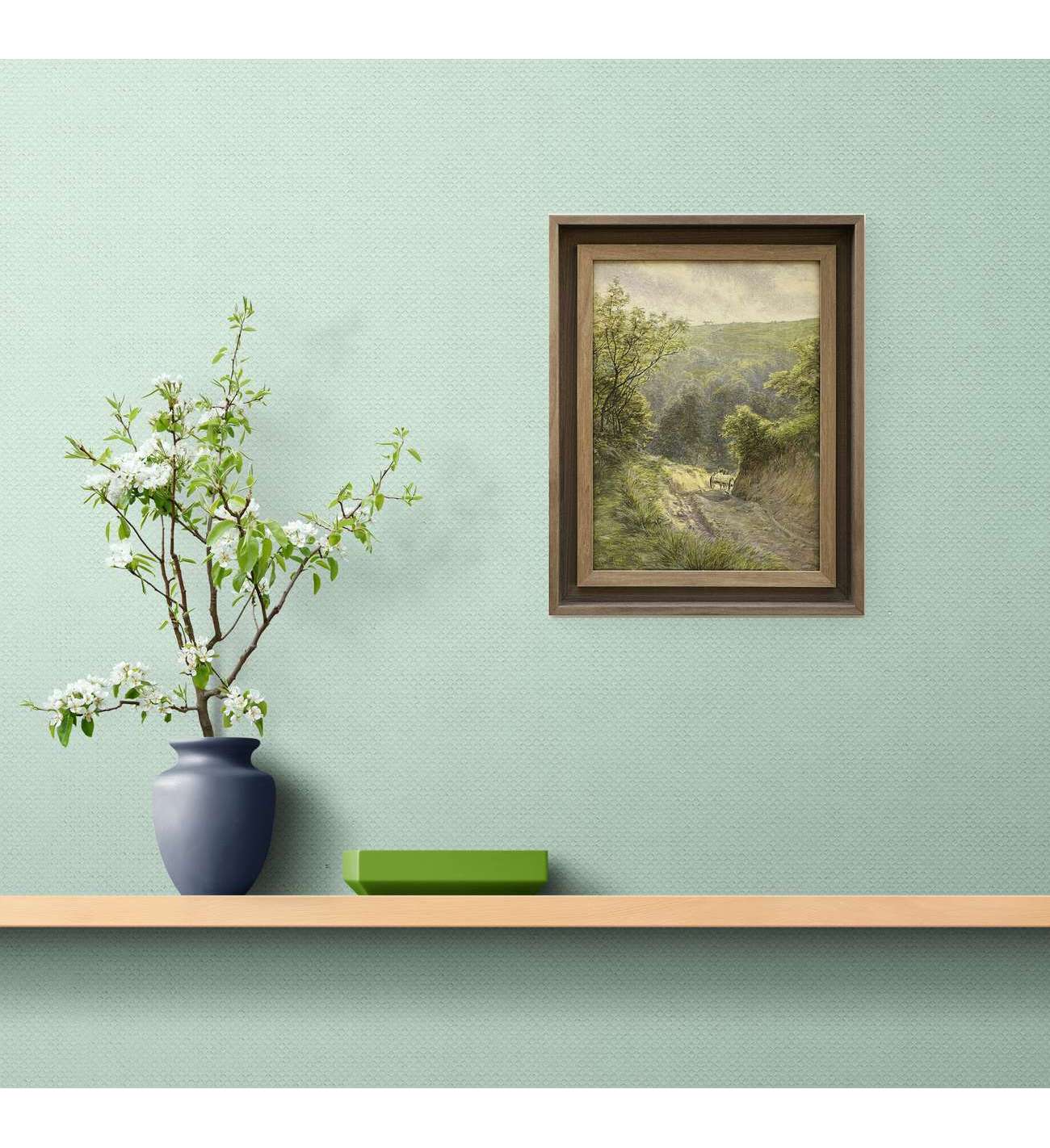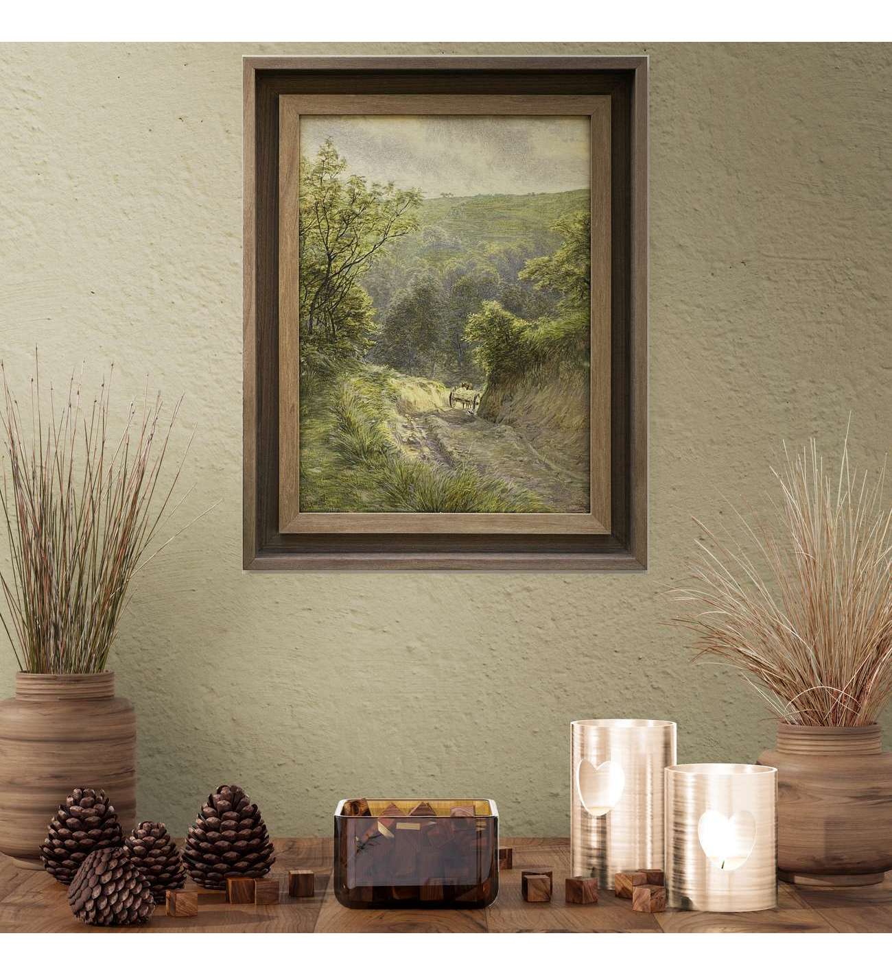 This atmospheric watercolour by Frank Walton, dated 1867 and signed lower left, reflects the artist’s technical skill and sensitivity in capturing the British countryside. Depicting a rural sandy path winding through dense woodland, the composition is subtly animated by a cart and horse, adding a quiet narrative to the scene. Sunlight filters gently through the foliage, resulting in a warm and diffuse light effect.