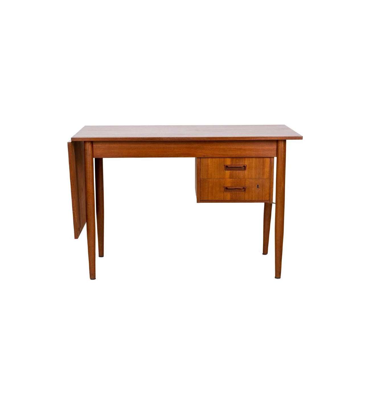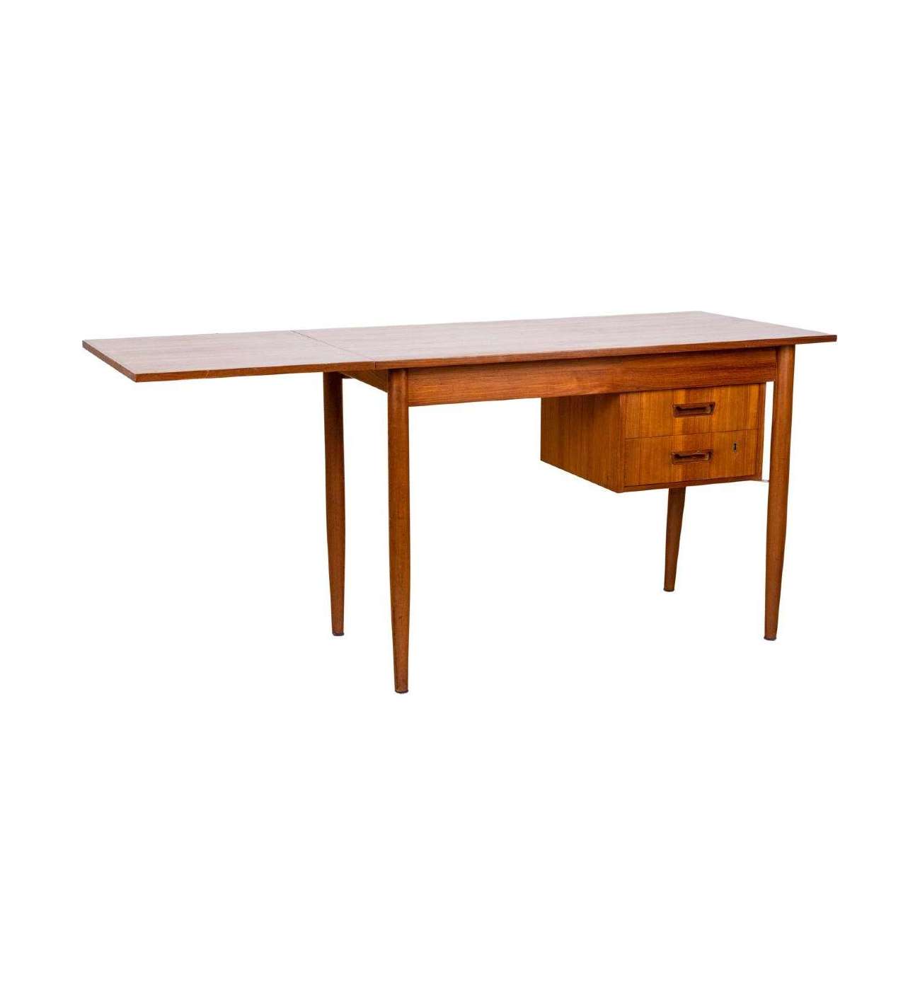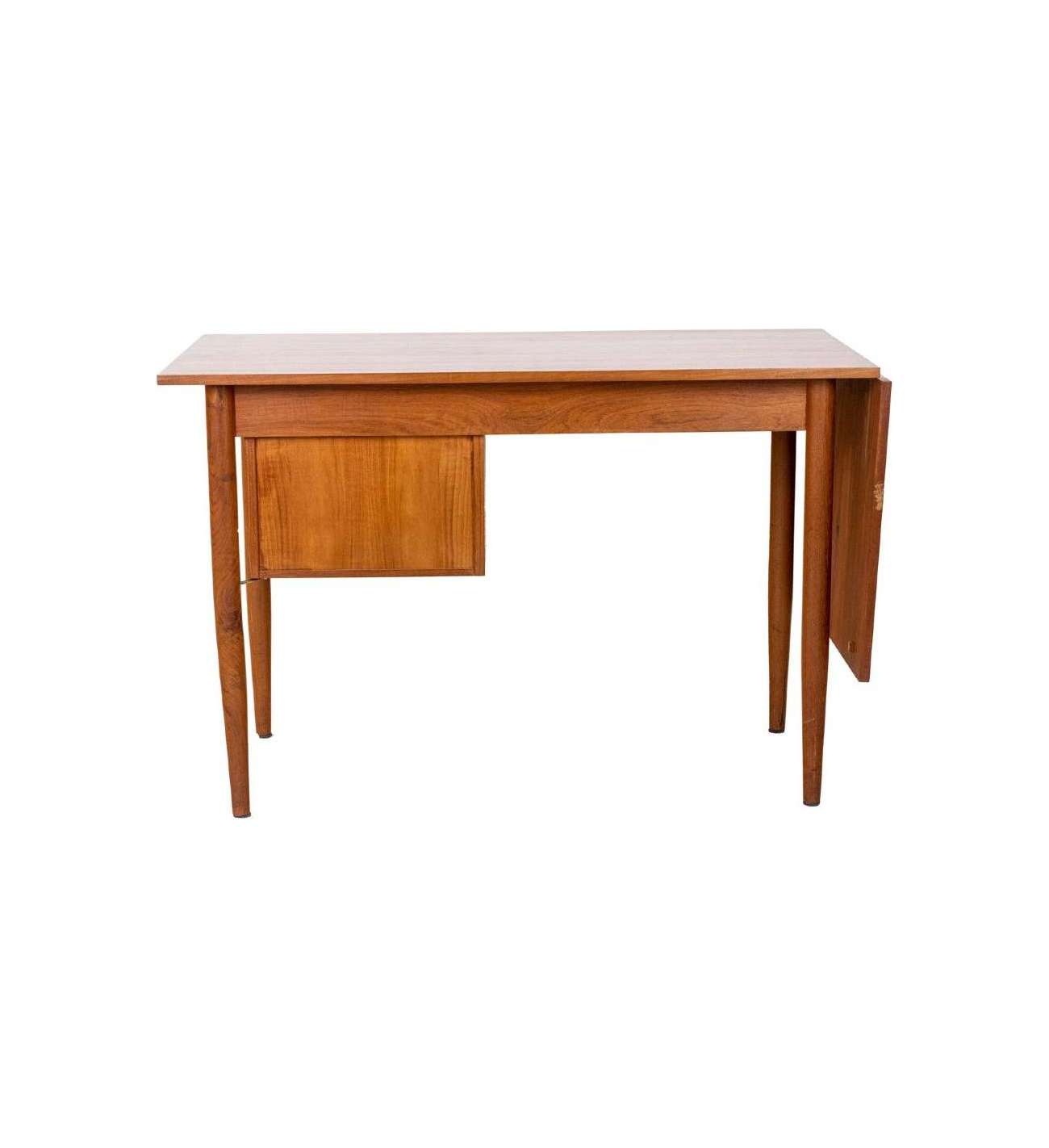 Bureau en teck, de forme rectangulaire et au plateau à allonge reposant sur un caisson constitué de deux tiroirs, avec sa chaise en teck au dossier de forme incurvée. Assise recouverte d’un cuir de couleur blanche. Piètements droits.