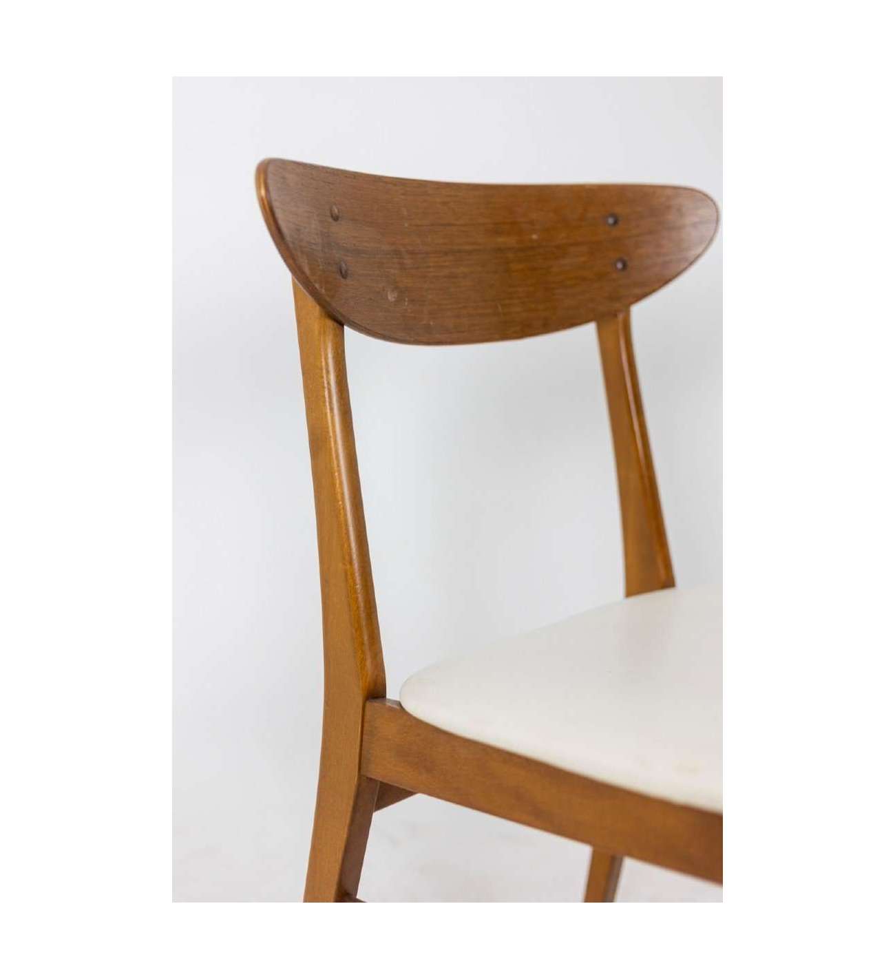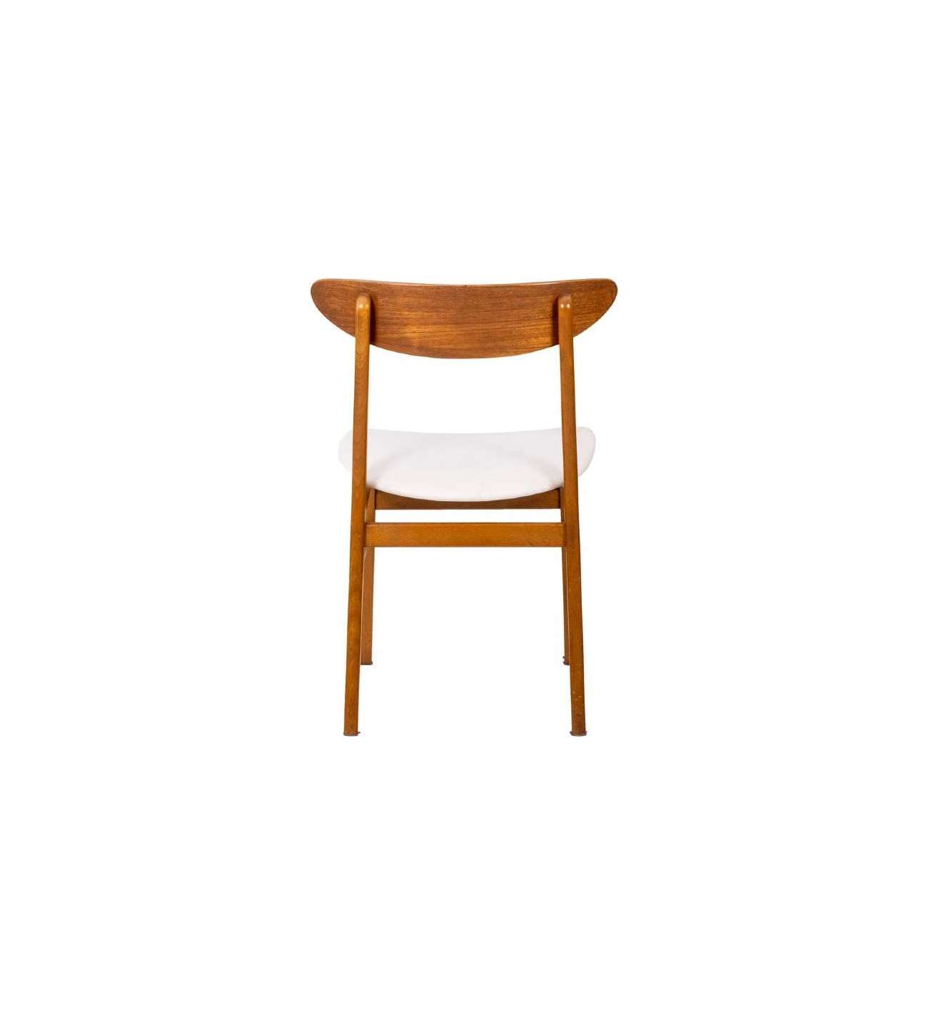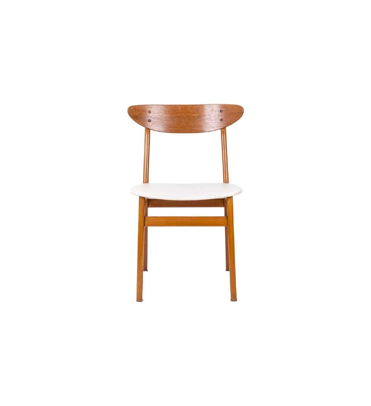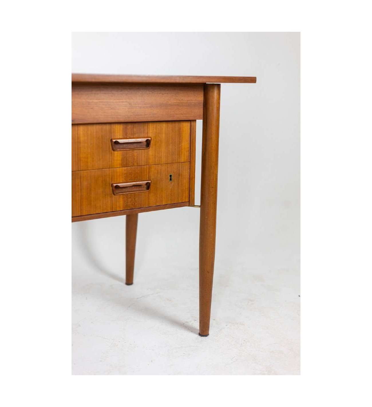 Bureau en teck, de forme rectangulaire et au plateau à allonge reposant sur un caisson constitué de deux tiroirs, avec sa chaise en teck au dossier de forme incurvée. Assise recouverte d’un cuir de couleur blanche. Piètements droits.