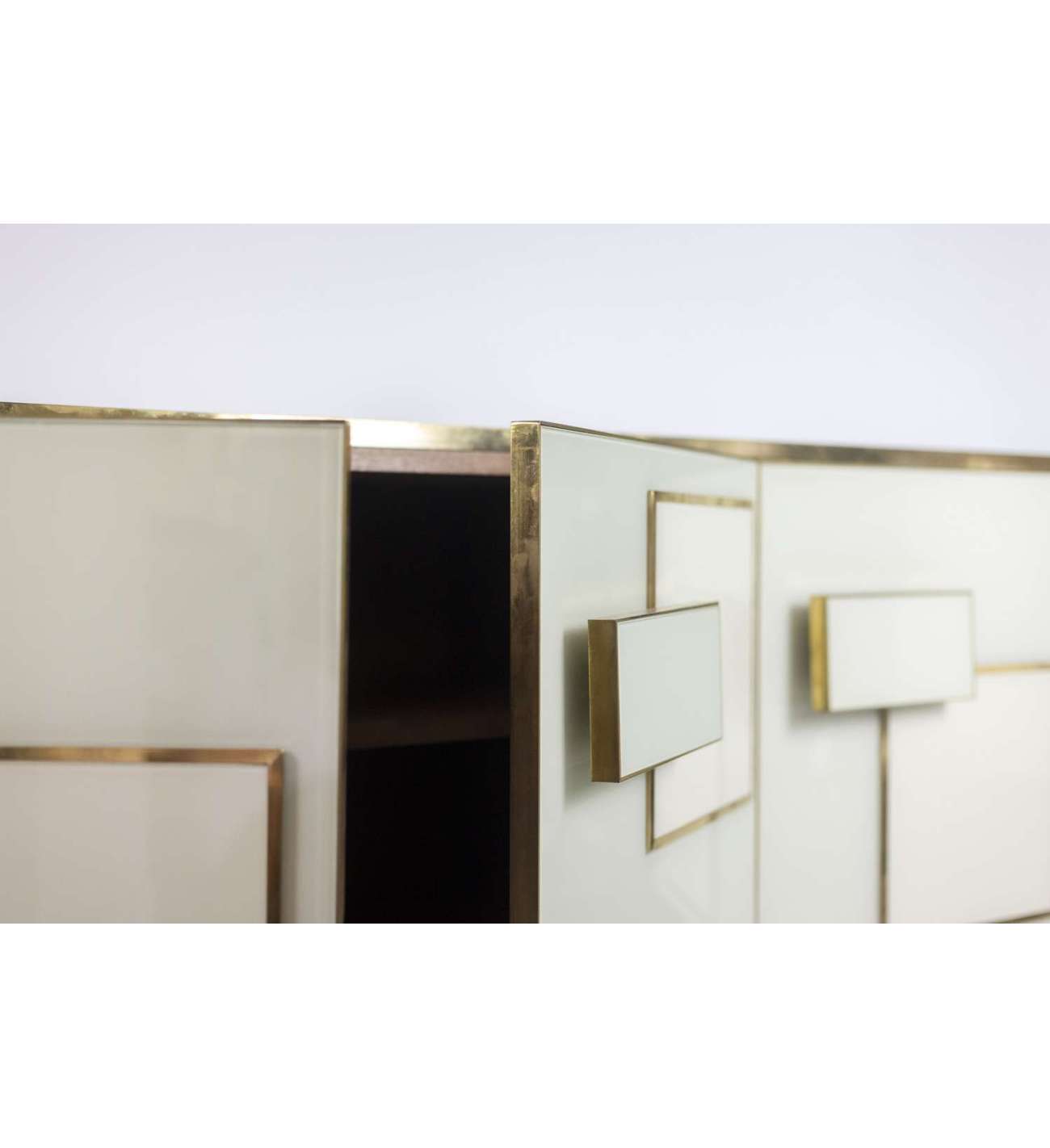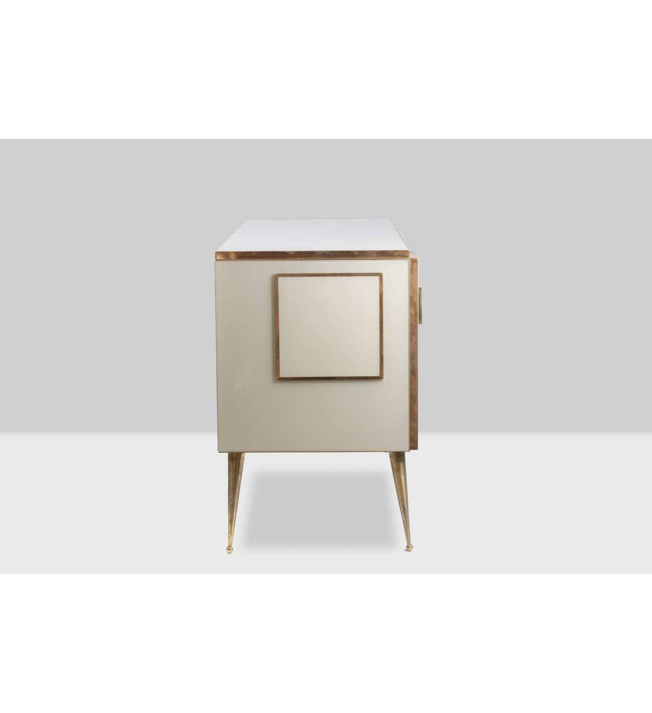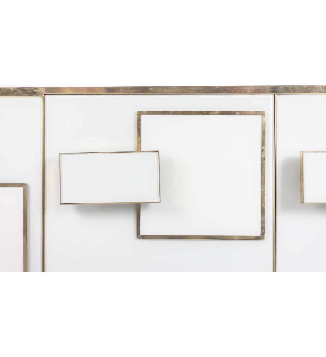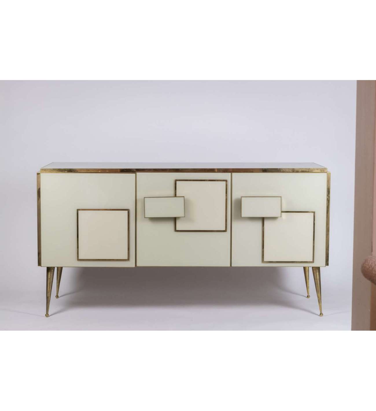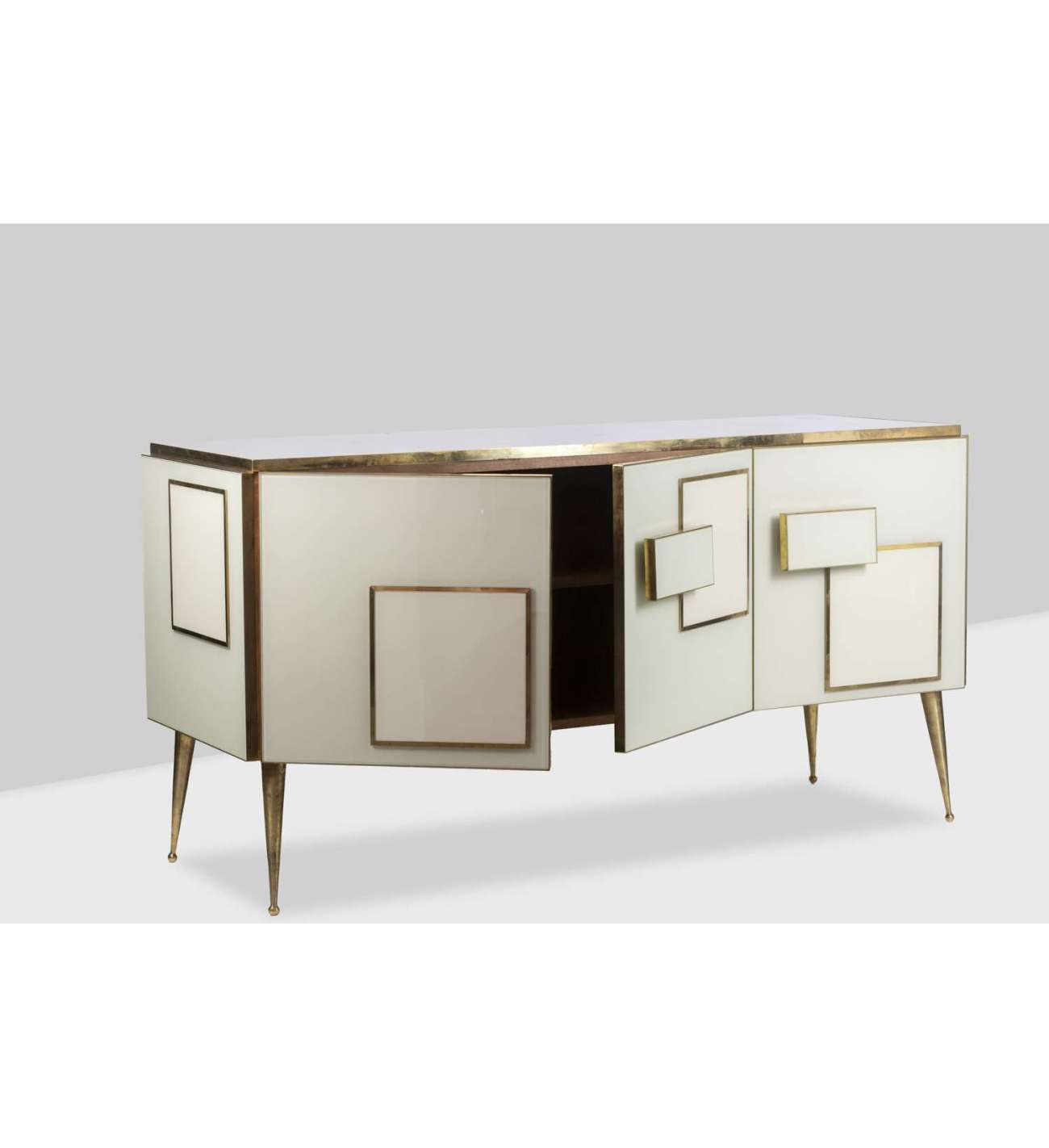 Il n'y a plus d'articles dans votre panierEnfilade en verre coloré blanc et laiton doré mat, ouvrant en façade par trois portes et à décor de formes carrées et rectangulaires, les formes rectangulaires servant de poignées. Piètement en laiton doré de forme fuseau, se terminant par de petites boules décoratives.