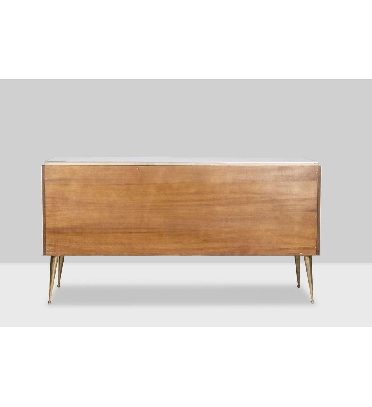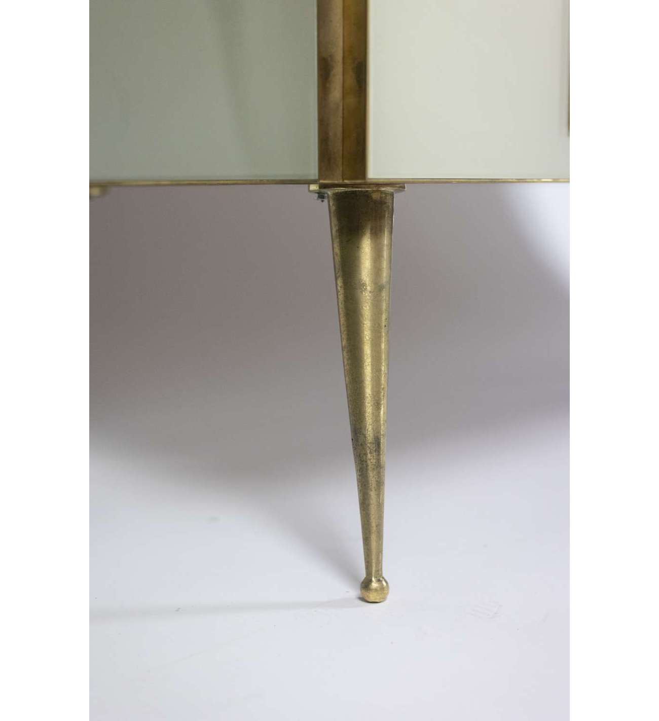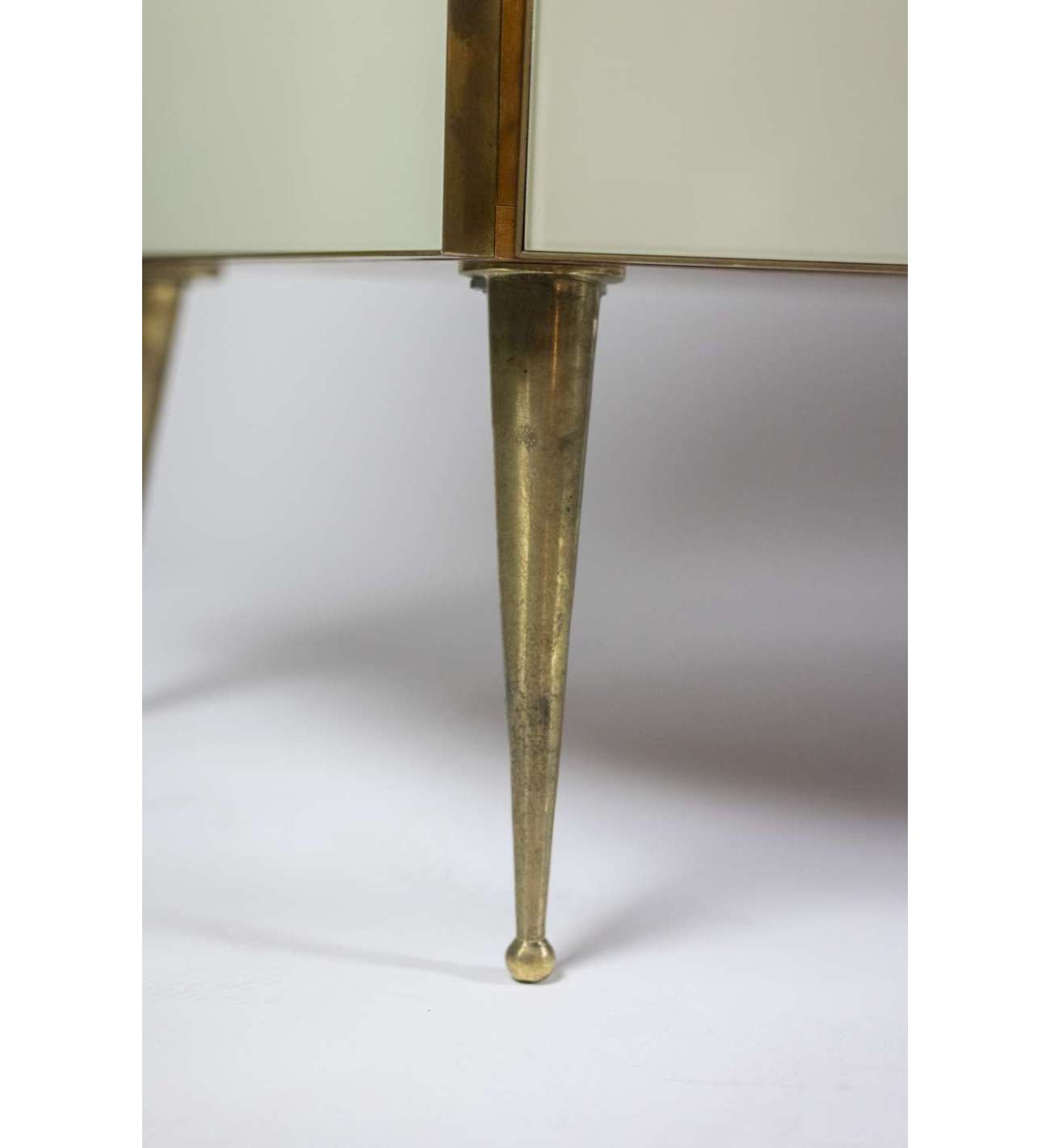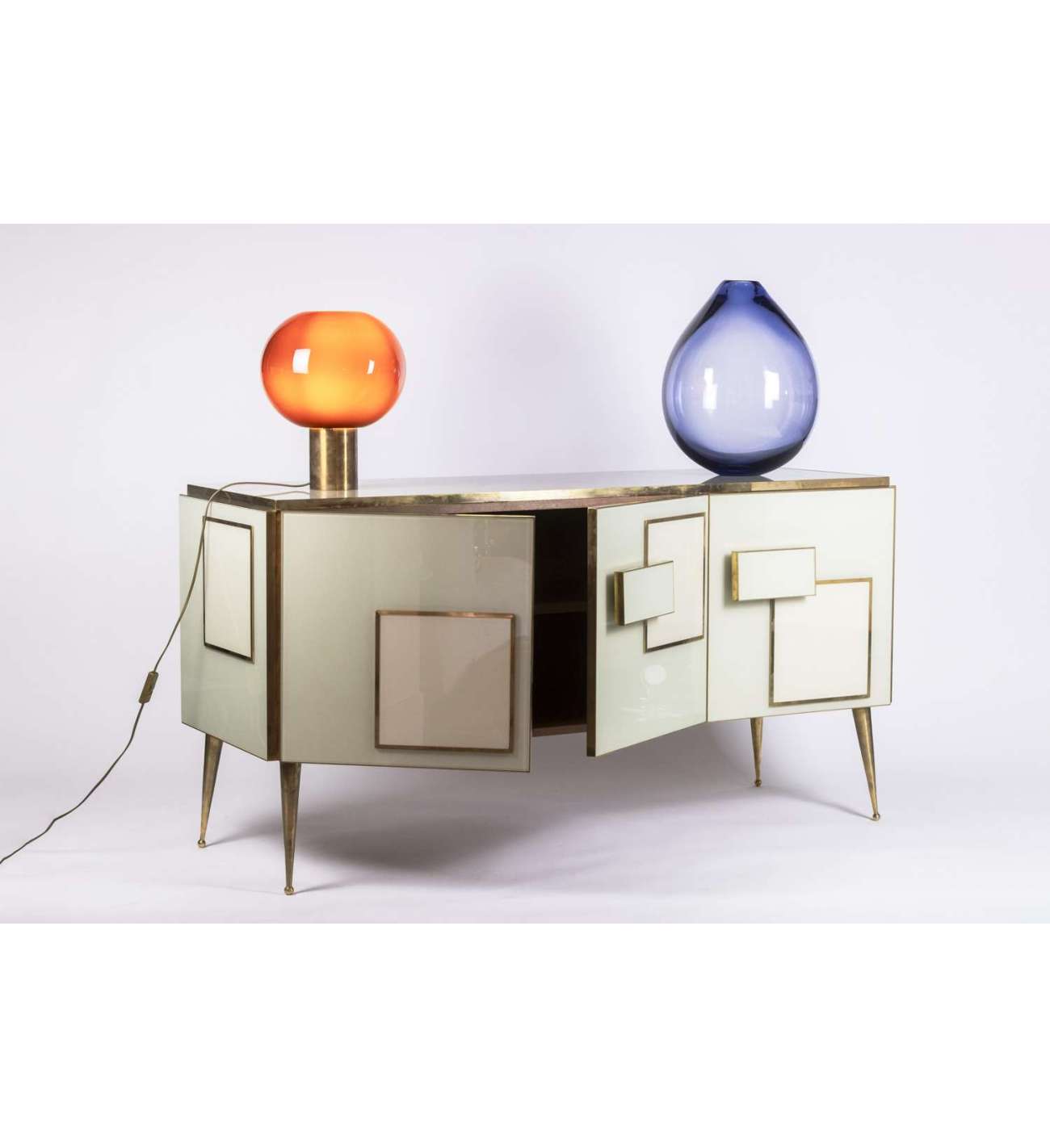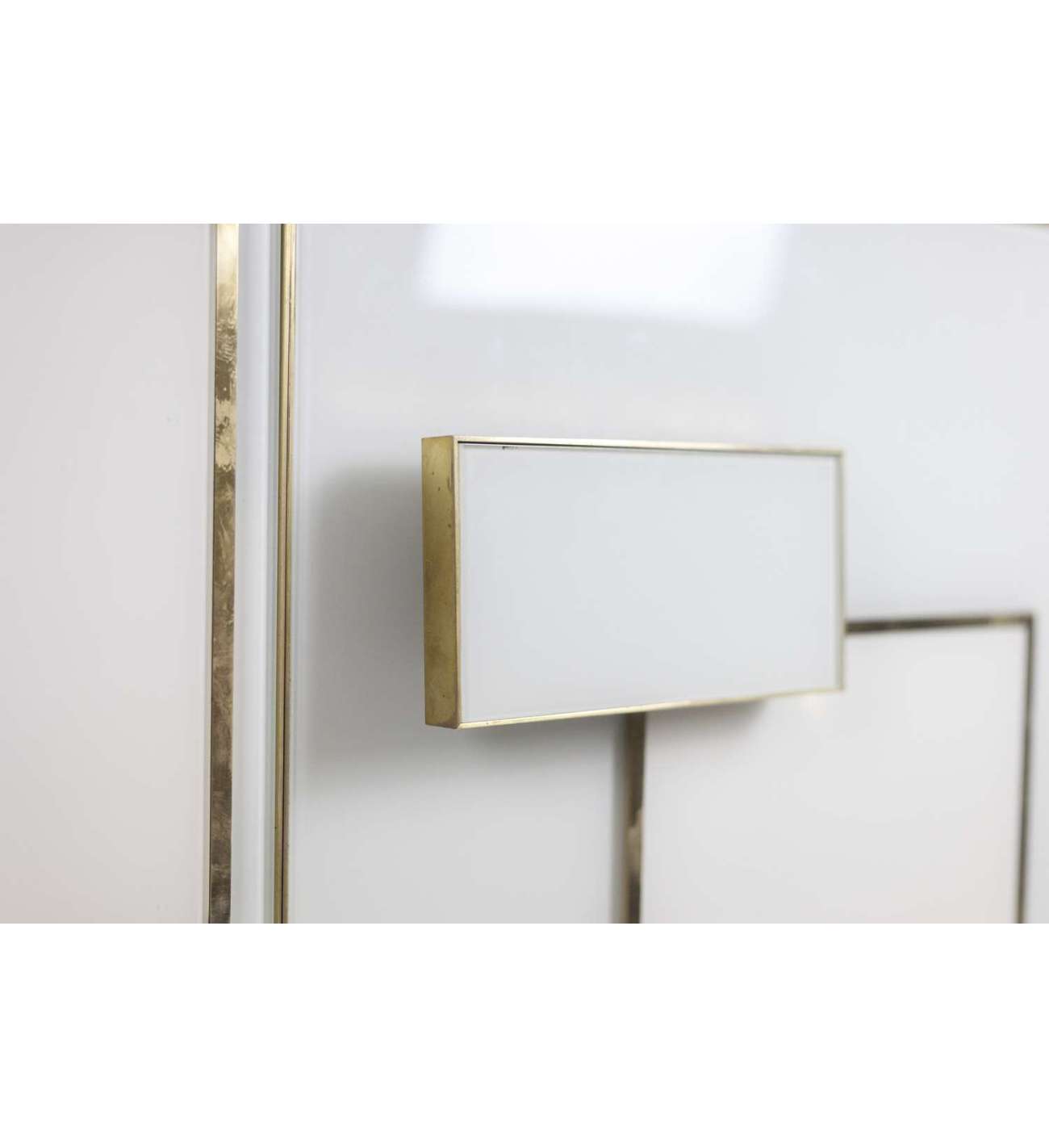Il n'y a plus d'articles dans votre panierEnfilade en verre coloré blanc et laiton doré mat, ouvrant en façade par trois portes et à décor de formes carrées et rectangulaires, les formes rectangulaires servant de poignées. Piètement en laiton doré de forme fuseau, se terminant par de petites boules décoratives.