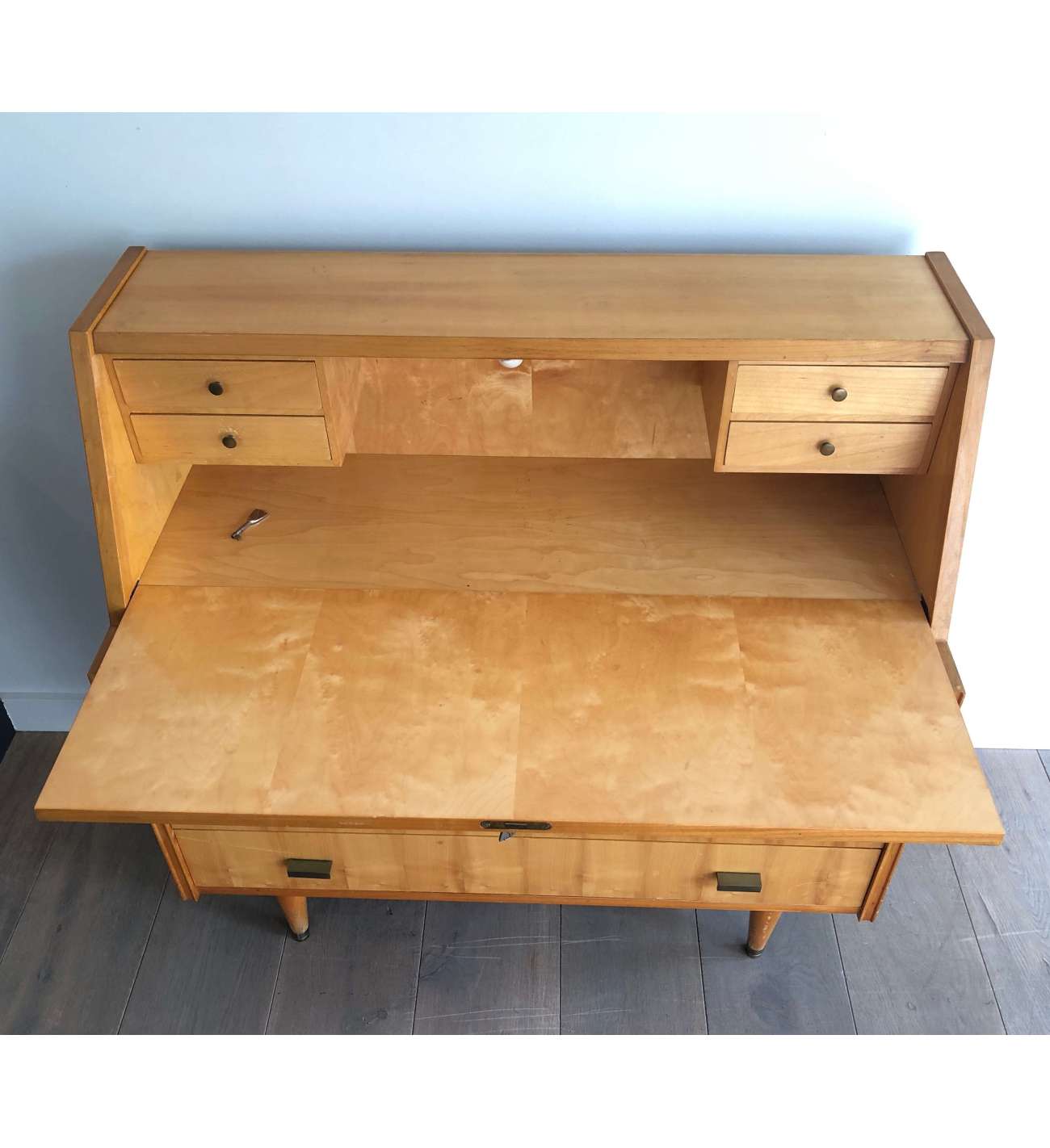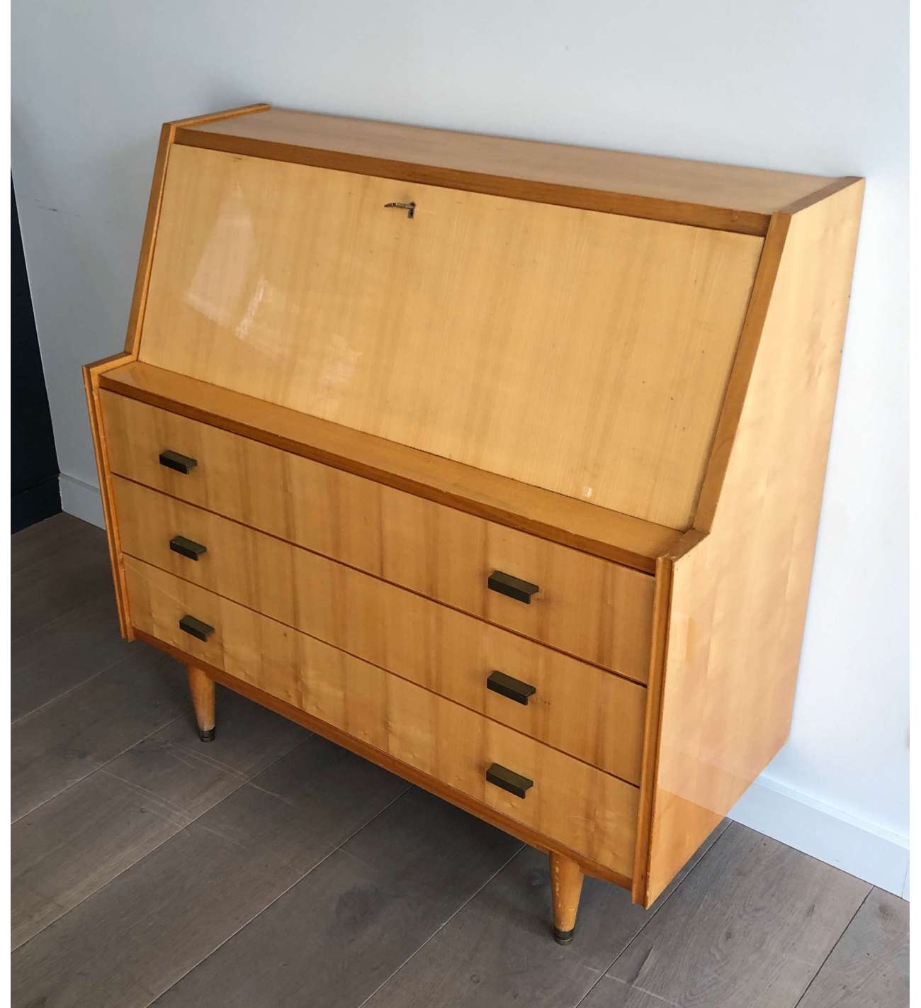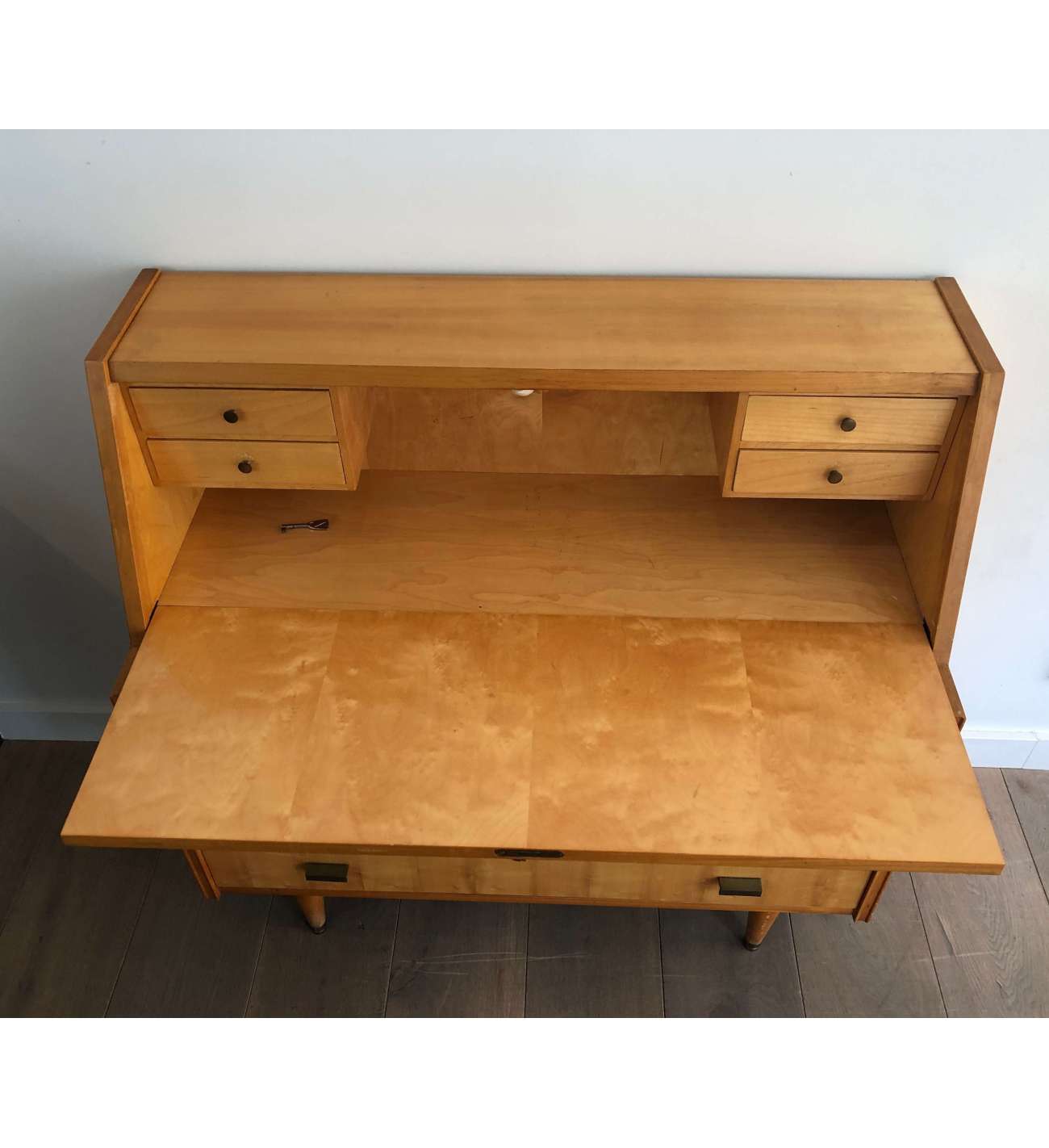 Il n'y a plus d'articles dans votre panierSecrétaire en sycomore et poignées de bronze composé d'un petit bureau de pente à abattant se refermant sur quatre tiroirs et formant commode à trois tiroirs en partie basse. Travail Français. Vers 1970