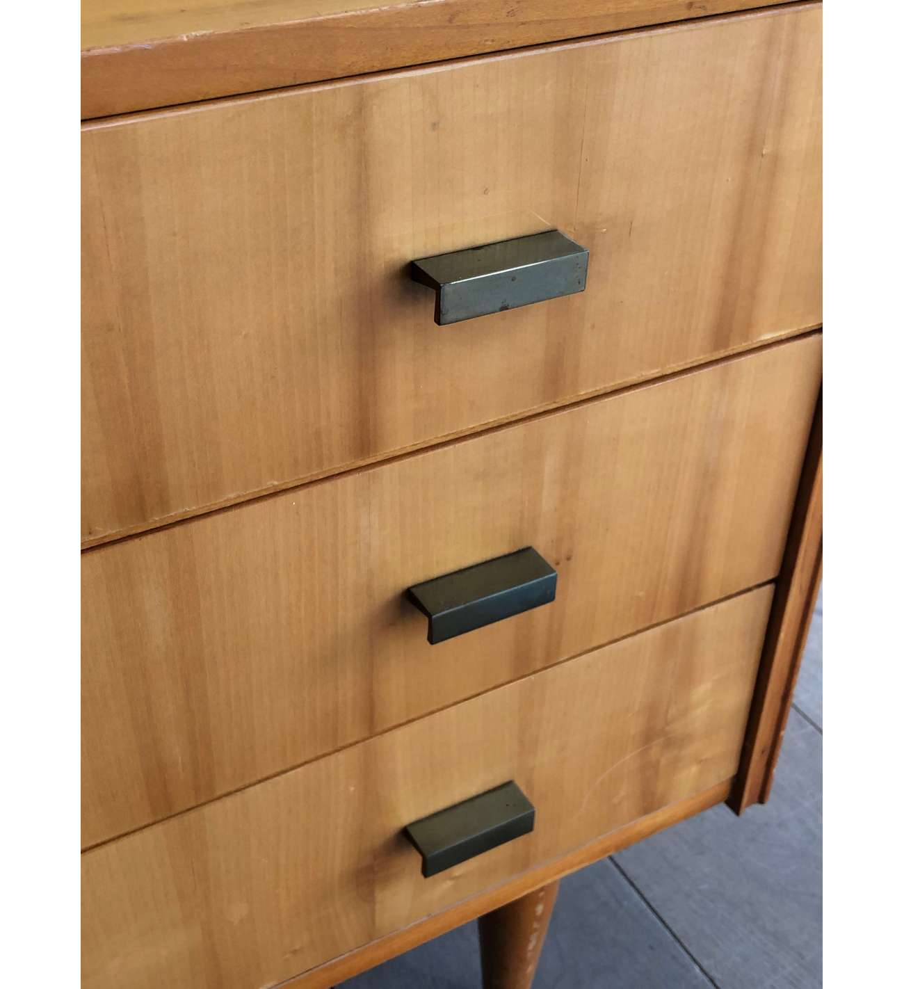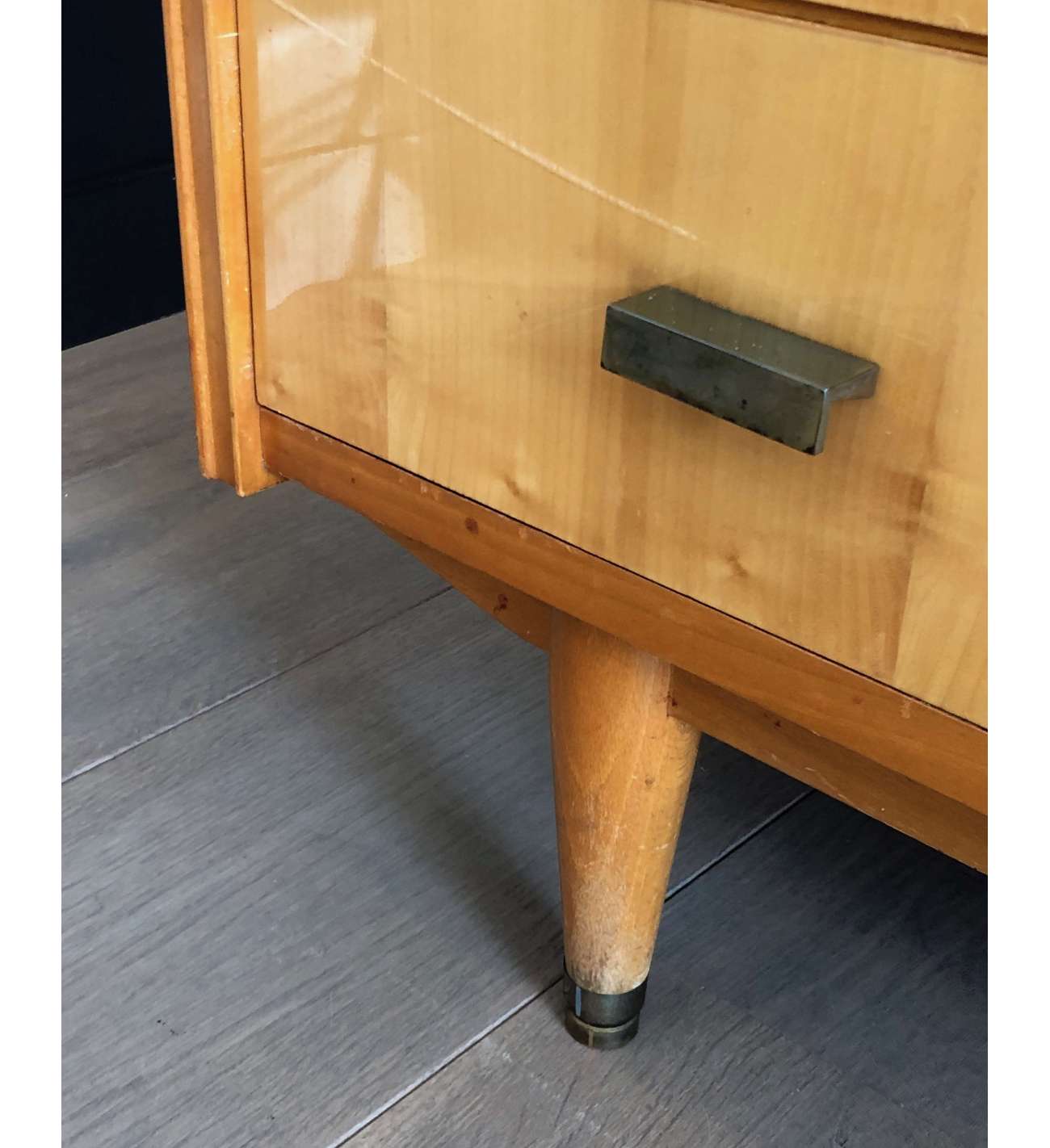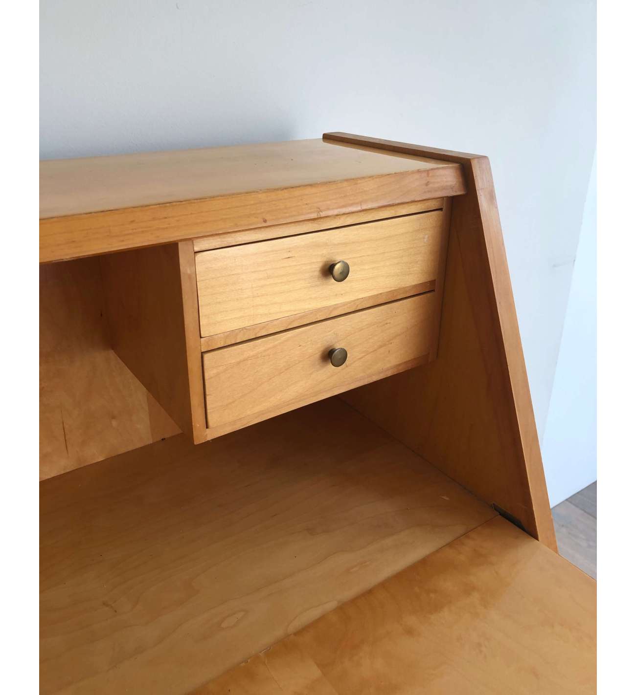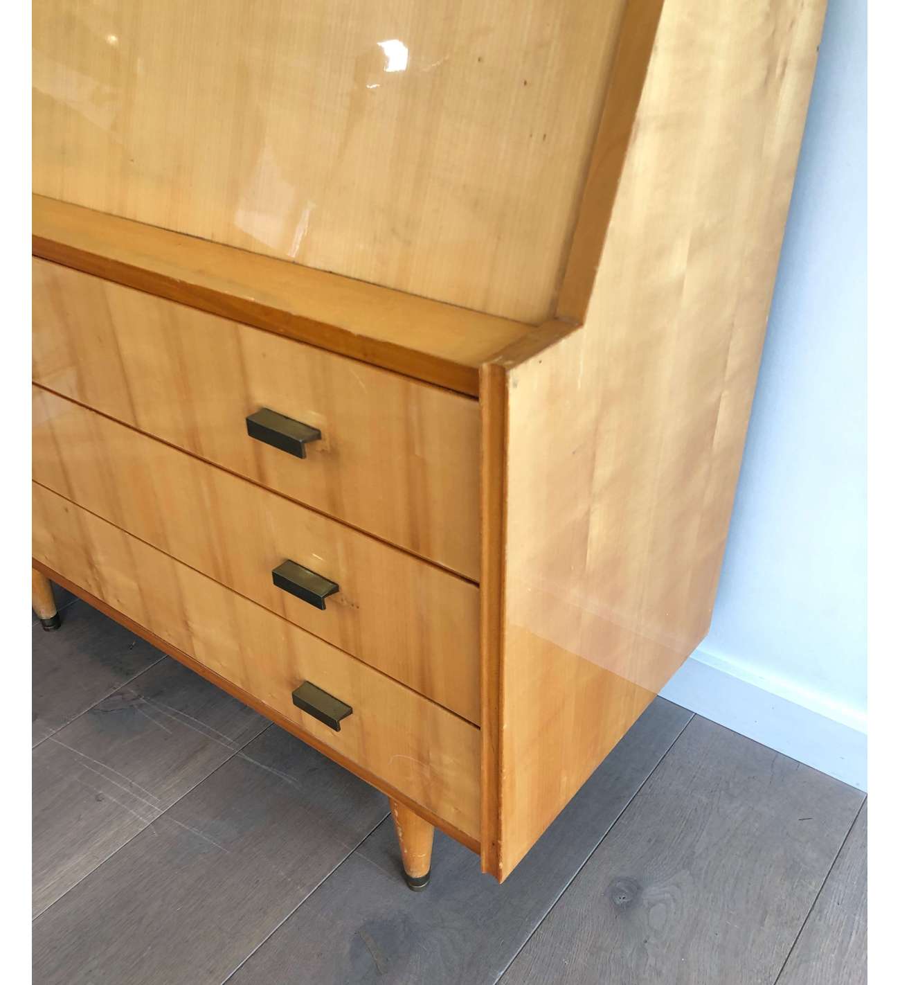 Il n'y a plus d'articles dans votre panierSecrétaire en sycomore et poignées de bronze composé d'un petit bureau de pente à abattant se refermant sur quatre tiroirs et formant commode à trois tiroirs en partie basse. Travail Français. Vers 1970