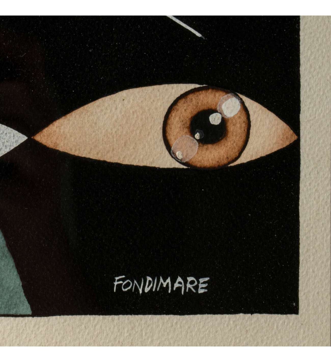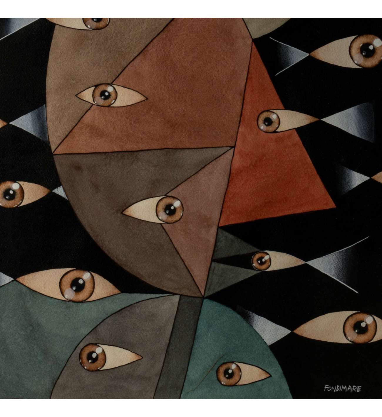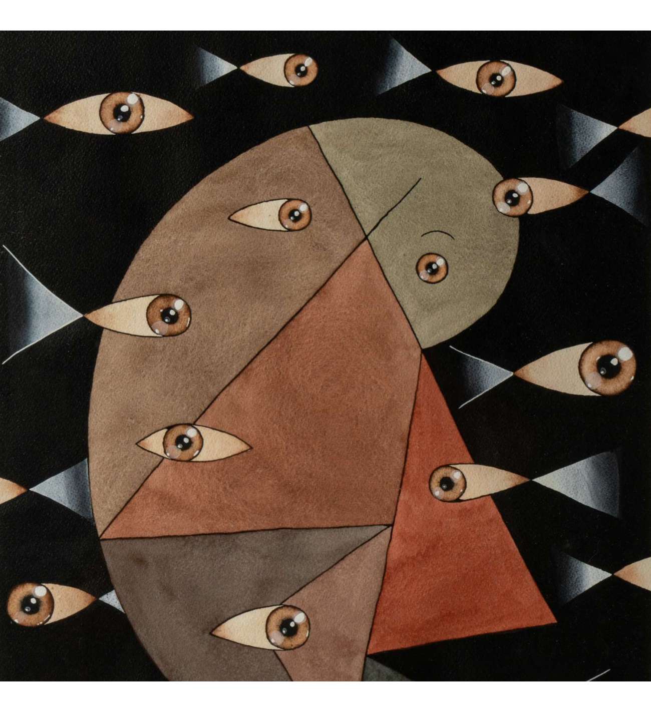 Gouache, ou technique mixte, de style Surréaliste, suggérant des visages abstraits et représentant des yeux, dans les tons rouge et bleu et sur un fond noir.