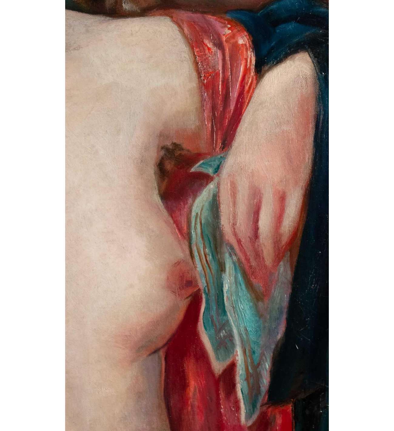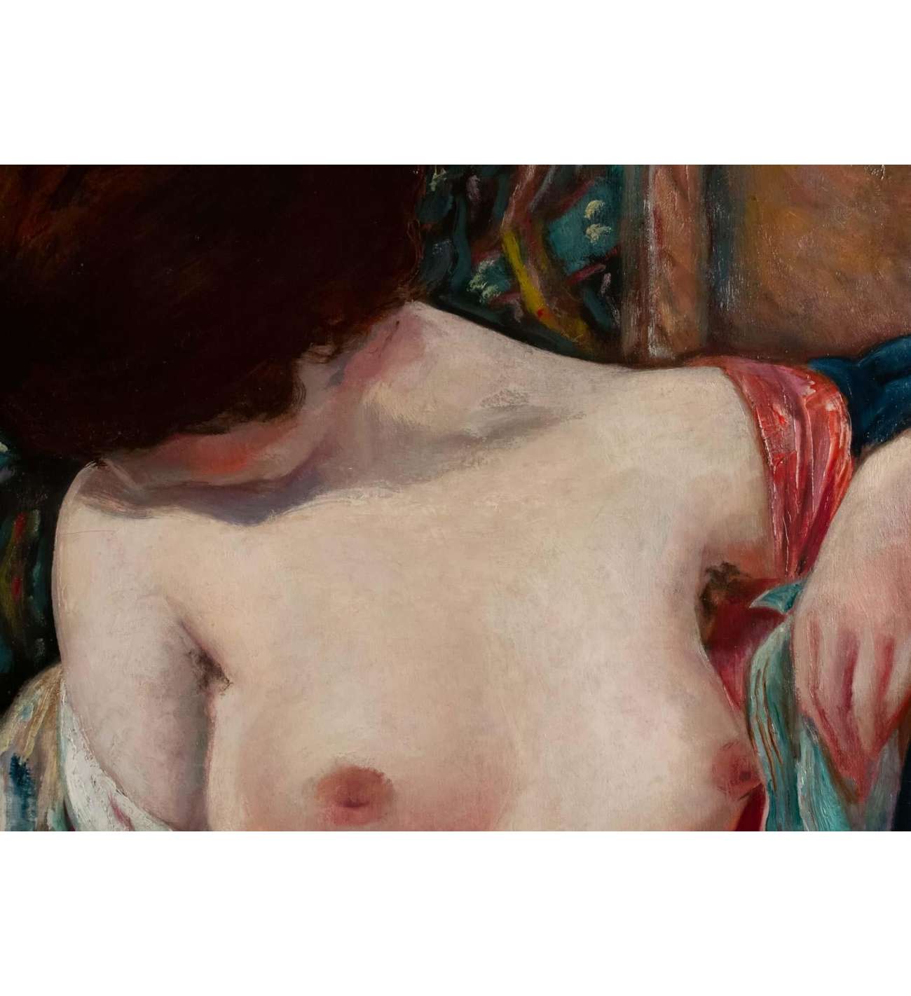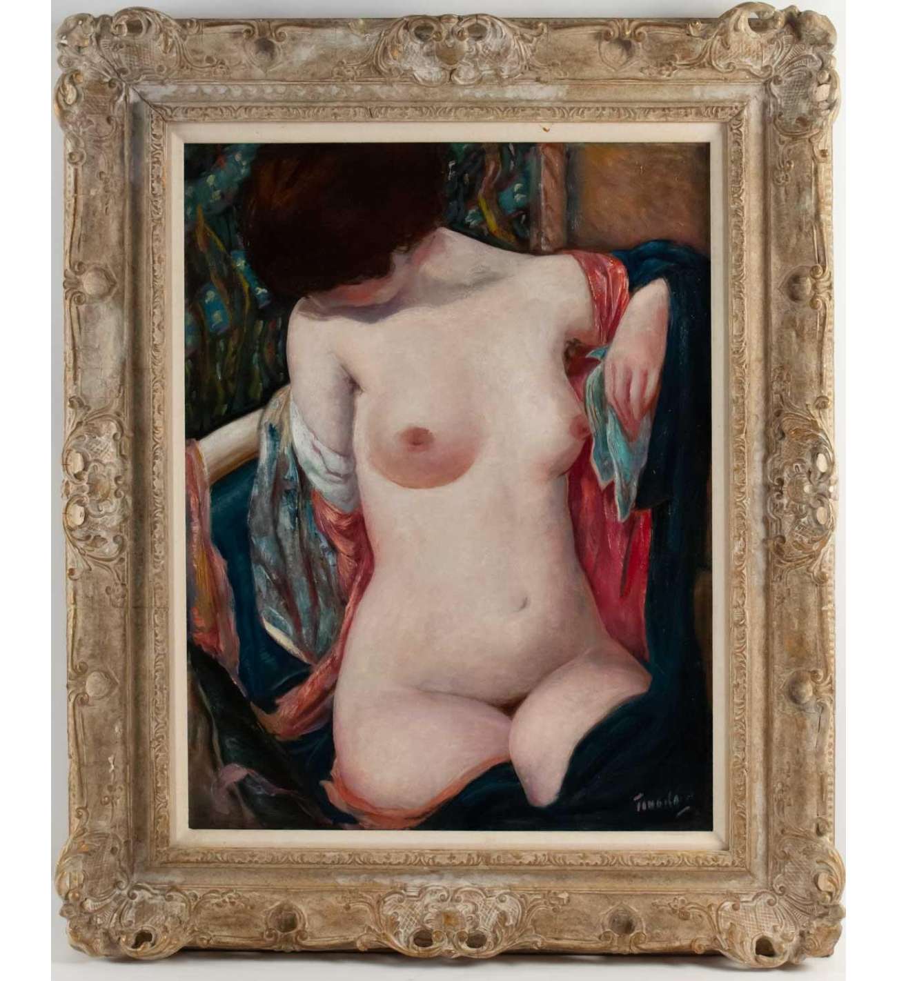 Yasushi Tanaka représente ce qu’il préfère : le nu féminin en intérieur. Sa palette est faite d’harmonies colorées, qu’il décline avec délicatesse. La peau de son modèle est parée de nuances subtiles, du violet au rose et passant par le bleu. Le modèle présente son buste de face et détourne le visage, comme c’est souvent le cas dans ses peintures de nus. L’intérieur est paré de tissus colorés et luxueux.