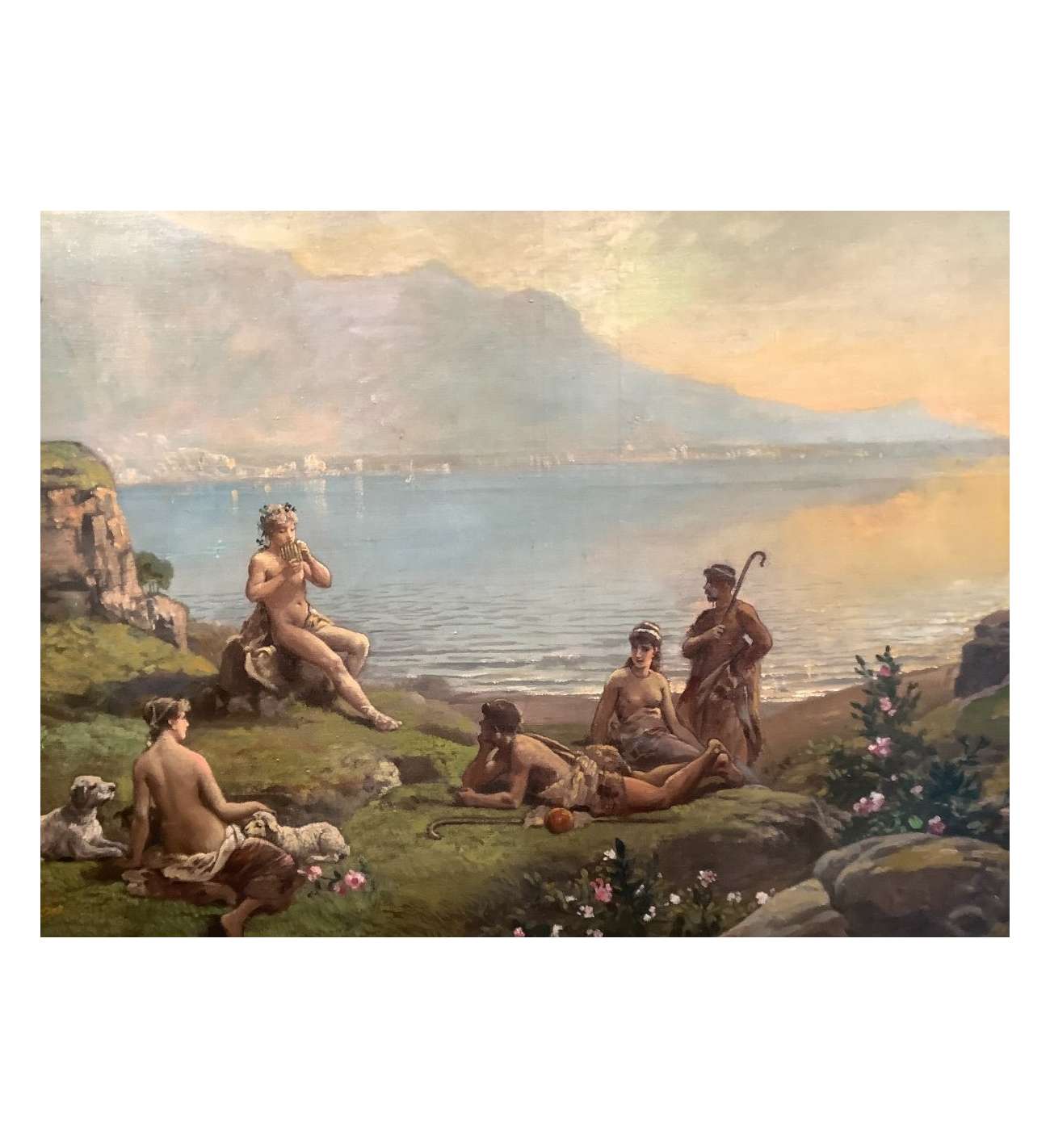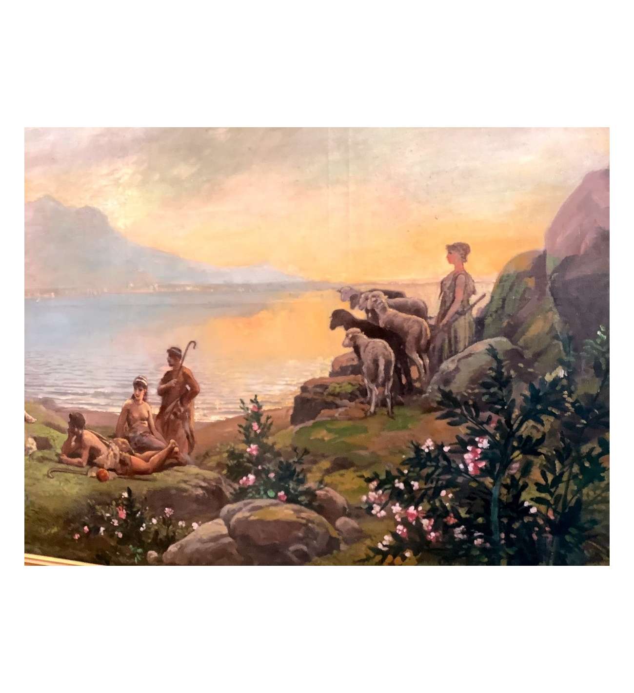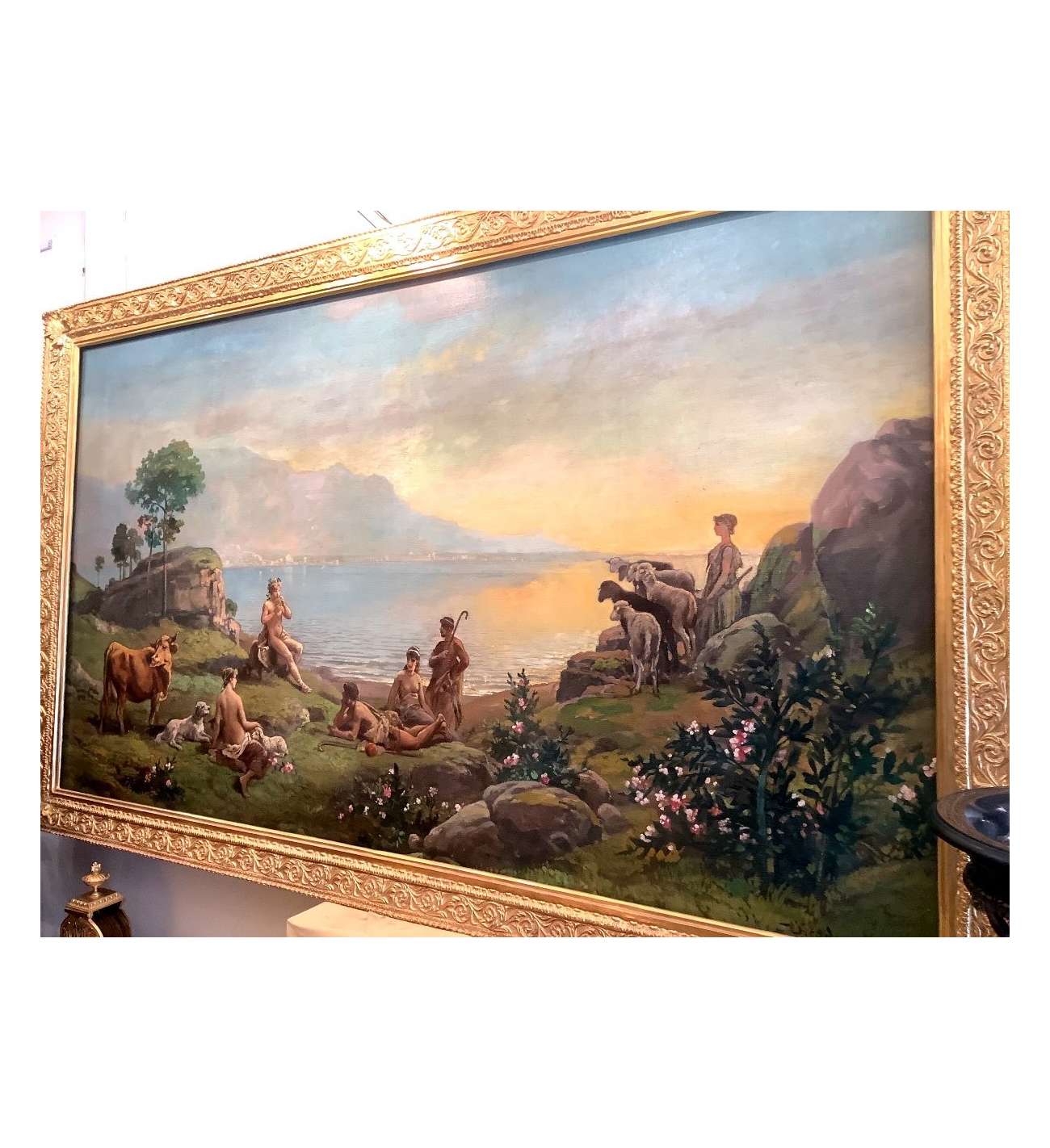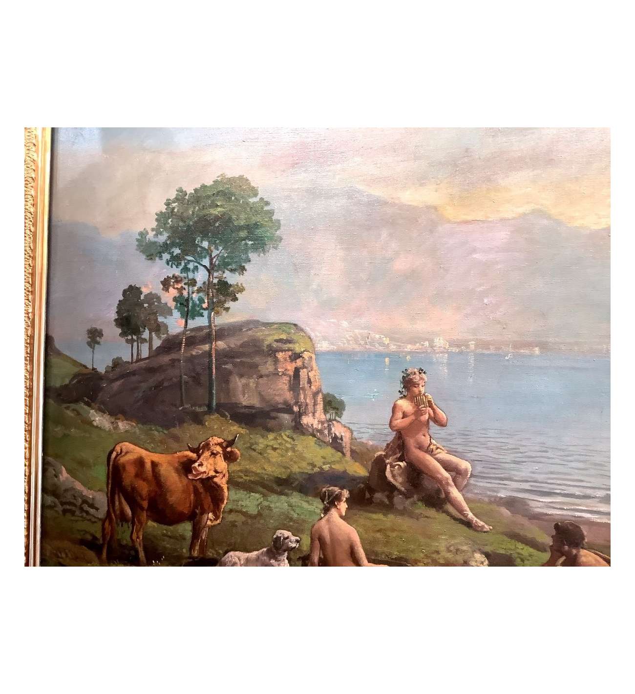 Superbe tableau de Salon représentant une scène bucolique en bordure de mer avec personnages et animaux .