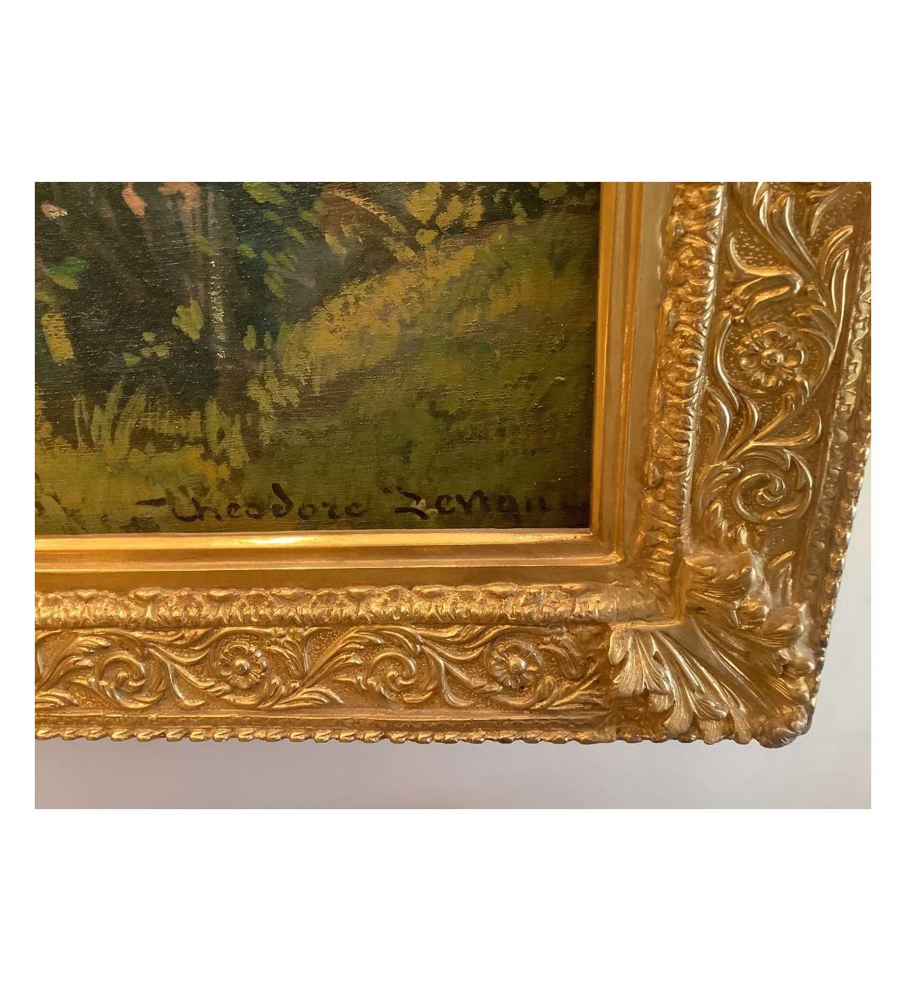 Huile sur toile signée en bas à droite , avec son important cadre en bois doré à la feuille d or à motifs de frises et palmettes .