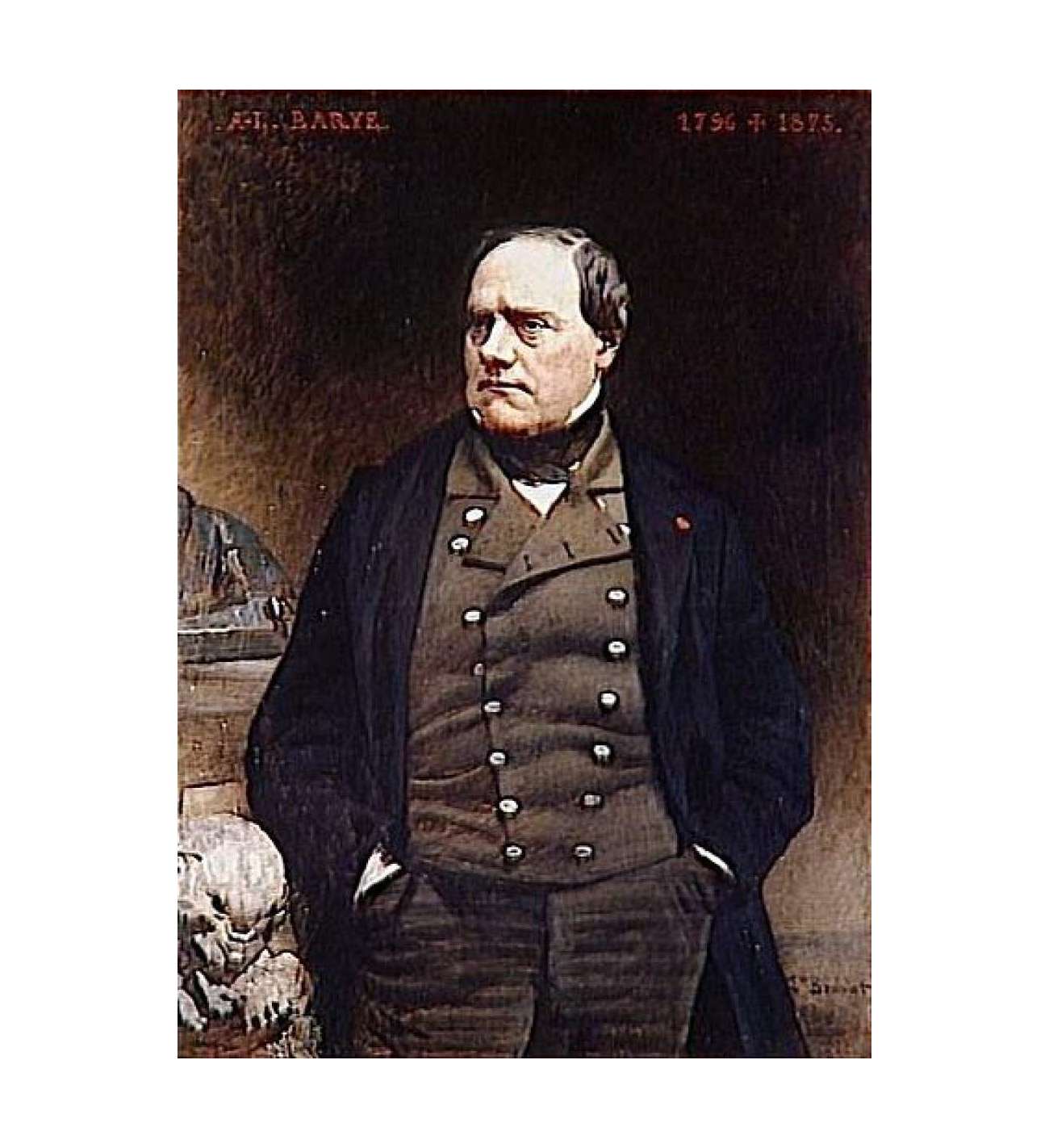 est un sculpteur français, renommé pour ses sculptures animalières. Sa pratique du croquis fait en milieu naturel, d’après les animaux du jardin des Plantes à Paris, l’amena petit à petit à pratiquer aussi la peinture. Placé très tôt chez Fourier, un graveur sur acier qui fabrique des matrices destinées à exécuter les parties métalliques des uniformes de la Grande Armée, il s’initie à tous les métiers du traitement du métal et devient un ciseleur hors pair. Il entre à l’École des beaux-arts de Paris en 1818, où il reçoit une formation classique dans l’atelier du sculpteur François-Joseph Bosio et du peintre Antoine-Jean Gros. Il obtient en 1820, le second prix de Rome de sculpture pour son Caïn maudit par Dieu. C’est en 1831 que Barye se fait connaître du public en exposant au Salon le Tigre dévorant un gavial, œuvre tourmentée et expressive, qui le classe aussitôt comme premier sculpteur romantique, alter ego d’Eugène Delacroix en peinture, et provoquant l’admiration de la critique. Il ne cesse désormais de produire des chefs-d’œuvre, souvent de petites dimensions, qui vont enrichir les collections des cabinets d’amateurs, des deux côtés de l’Atlantique. En 1833, Barye expose son Lion au serpent au Salon, une commande du roi pour le jardin des Tuileries, une allégorie de la monarchie écrasant la sédition, trois ans après la Révolution de juillet.