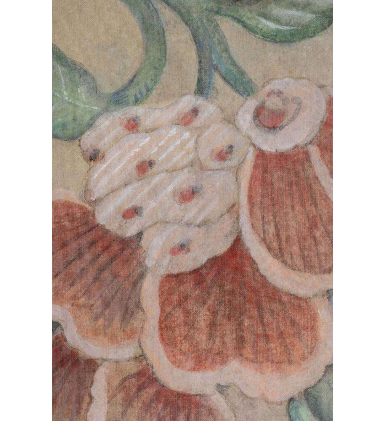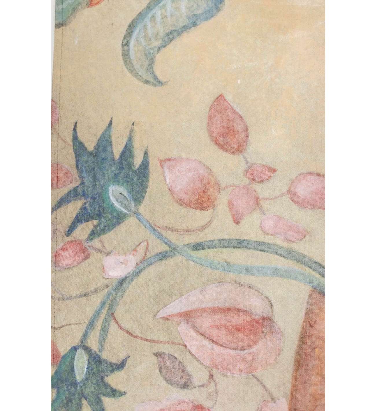 Toile brute en lin peinte à la main avec des pigments naturels et motifs dorés réalisés à la feuille de cuivre. Toile tendue à l’aide de deux baguettes en bois dont celle du bas est amovible, permettant de la rouler pour le transport.