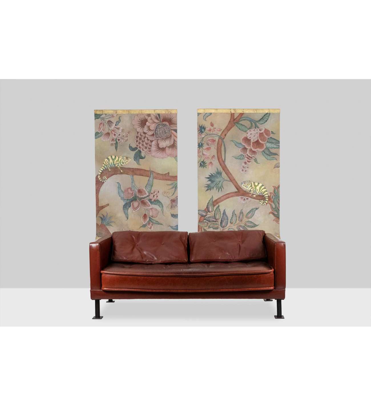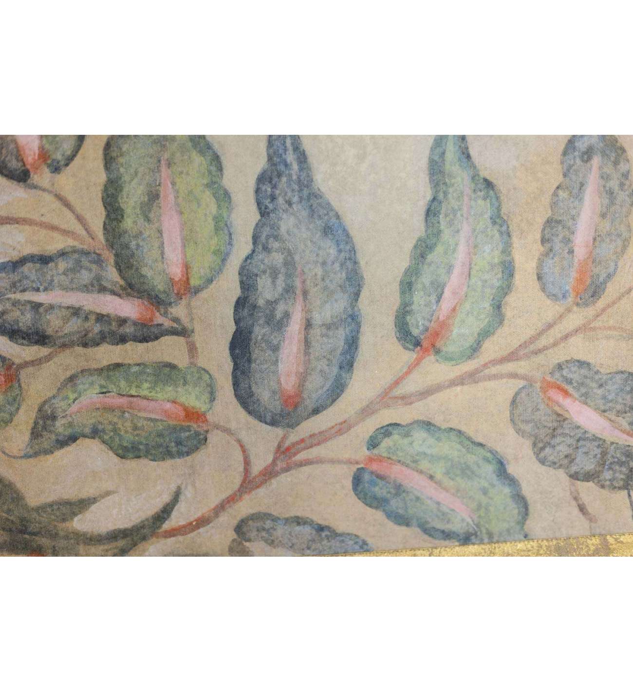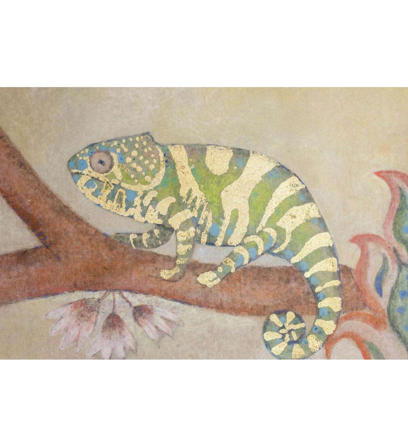 Toile peinte ou panneau décoratif représentant un caméléon sur sa branche, à droite, avec un fond feuillagé et stylisé dans les tons bleu et rose. On distingue un petit éventail avec des arabesques ou des volutes à droite de la composition.
