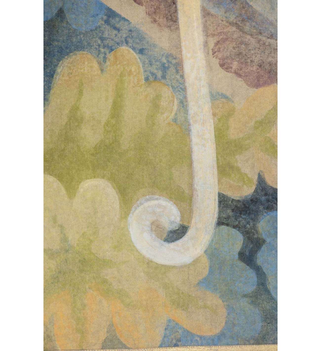Toile brute en lin peinte à la main avec des pigments naturels et motifs dorés réalisés à la feuille de cuivre. Toile tendue à l’aide de deux baguettes en bois dont celle du bas est amovible, permettant de la rouler pour le transport.