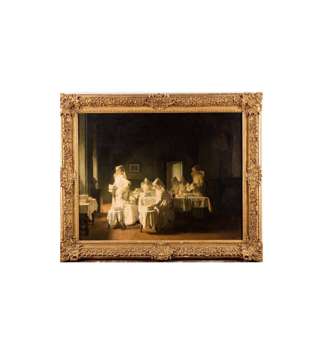 Ce tableau des religieuses de l'Hôtel Dieu de Beaune fait partie de la série de scènes d'intérieur qu'il a peintes suite à sa visite des Hospices de Beaune en 1902. Il a représenté différentes situations dans l'hôpital, et lorsqu'il les a exposées au Salon de 1903, Bail était à l'apogée de sa carrière artistique. Il avait reçu une médaille d'honneur au Salon de 1902 et, surtout, il avait reçu une médaille d'or à l'Exposition universelle de 1900. Le fait que ces peintures aient été largement applaudies dans la presse en 1903 marque l'acceptation par le public d'une série de compositions à grande échelle consacrées aux œuvres des Sœurs de la Charité, ce qui démontre encore la manière dont les peintures de Bail touchent un vaste public.