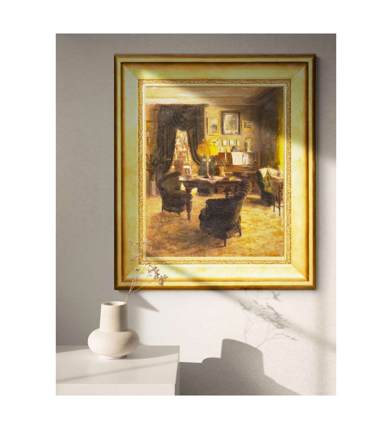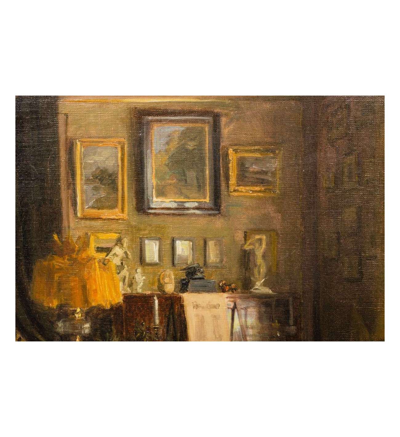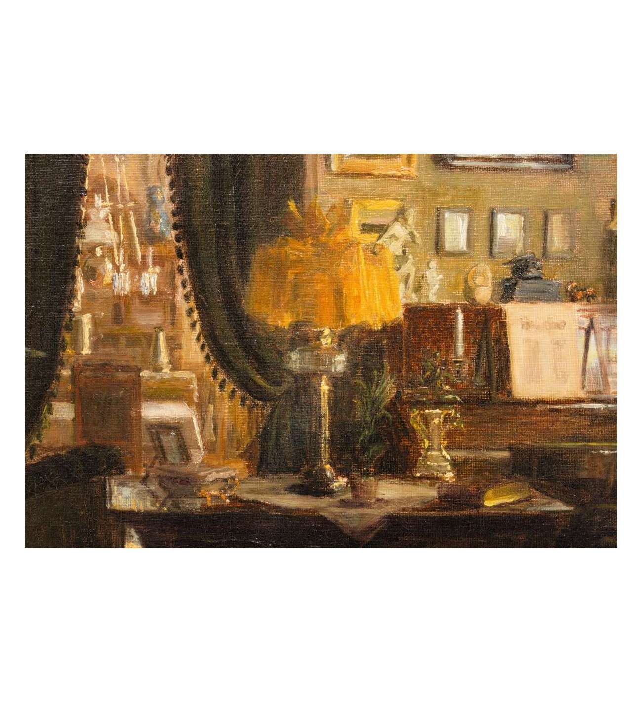 Clausen capture efficacement une atmosphère chaleureuse, sereine et légèrement nostalgique. Le choix de couleurs chaudes et les jeux d'ombre et de lumière créent un sentiment de tranquillité et de confort. L'attention méticuleuse de Clausen pour les détails est évidente dans le rendu complexe du mobilier, les textures des tissus et les reflets de la lumière. Cette précision contribue à transmettre la richesse de l'intérieur et la personnalité de l'espace. Le tableau met en évidence l'habileté de Clausen à capturer les jeux d'ombre et de lumière, une caractéristique de son travail. Son style se concentre souvent sur des scènes domestiques, capturant les moments calmes et intimes de la vie quotidienne.