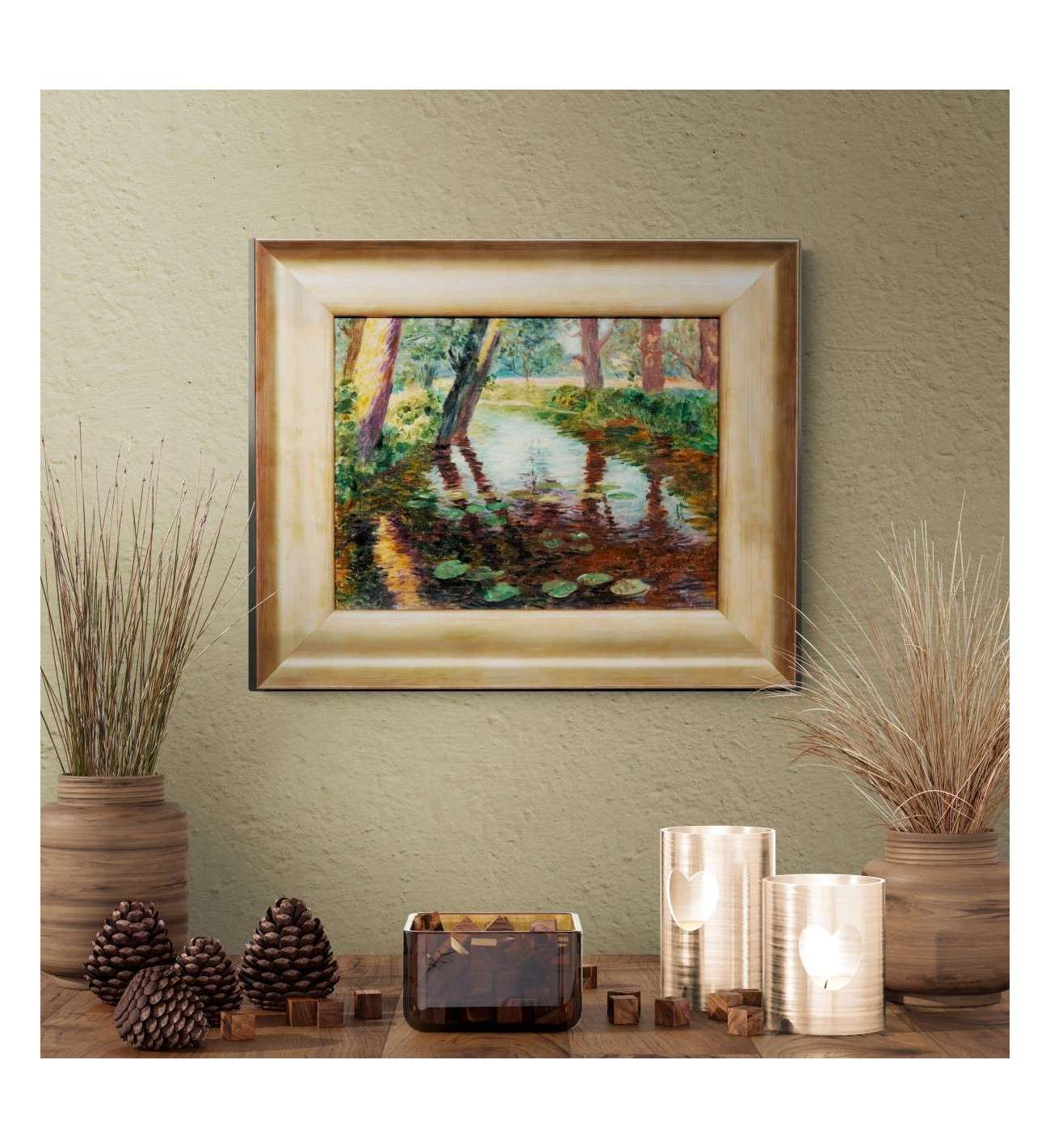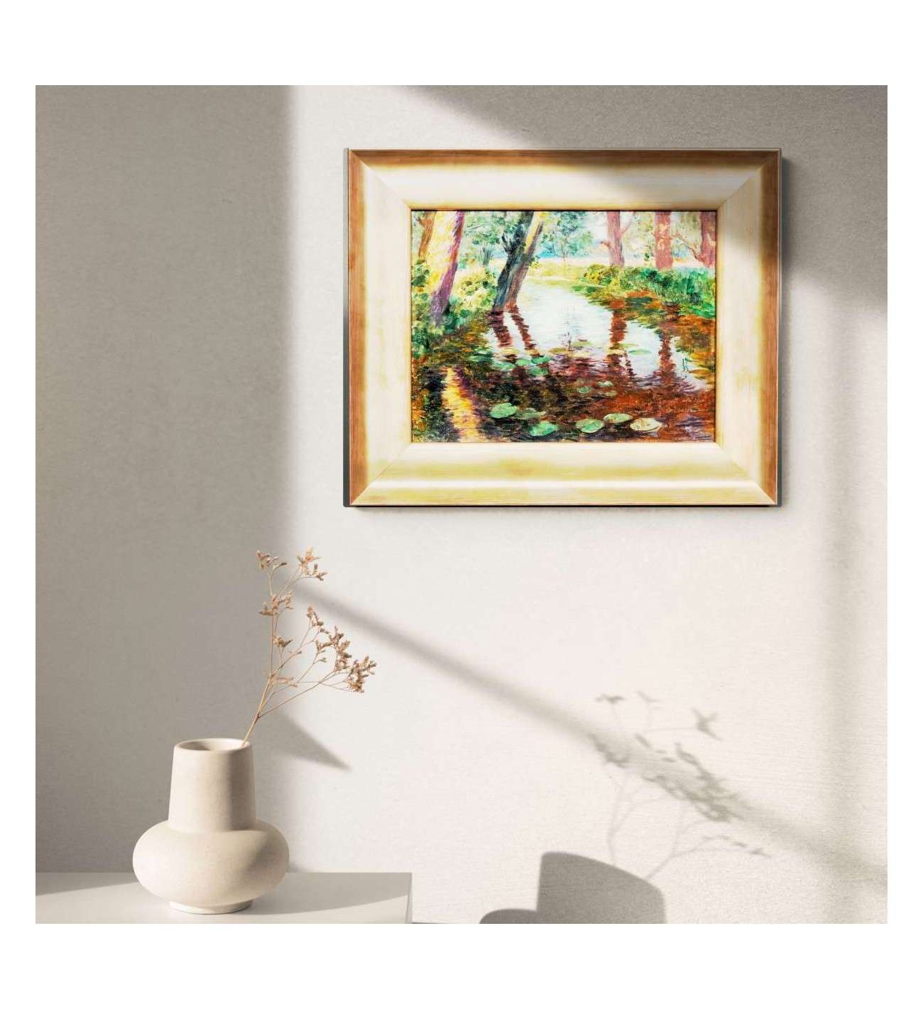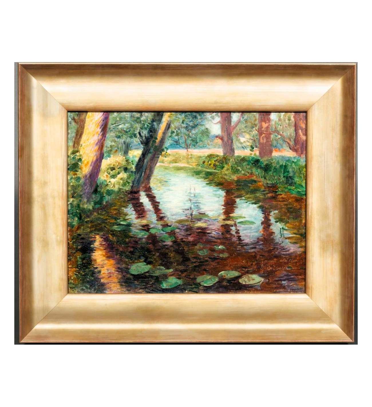 Le tableau capture une scène naturelle sereine, un ruisseau qui coule lentement, entouré d'une verdure luxuriante. La composition est équilibrée, les arbres penchant vers le centre, créant un cadre naturel pour le plan d'eau. Le premier plan présente la surface réfléchissante de l'eau, ornée de nénuphars flottants. Les reflets des arbres et de la lumière sur l'eau ajoutent de la profondeur et de la complexité à la composition. L'arrière-plan s'estompe pour laisser place à un paysage clair et ensoleillé, suggérant un champ ouvert ou une continuation de la forêt. Le jeu de l'ombre et de la lumière crée une atmosphère à la fois dynamique et tranquille.