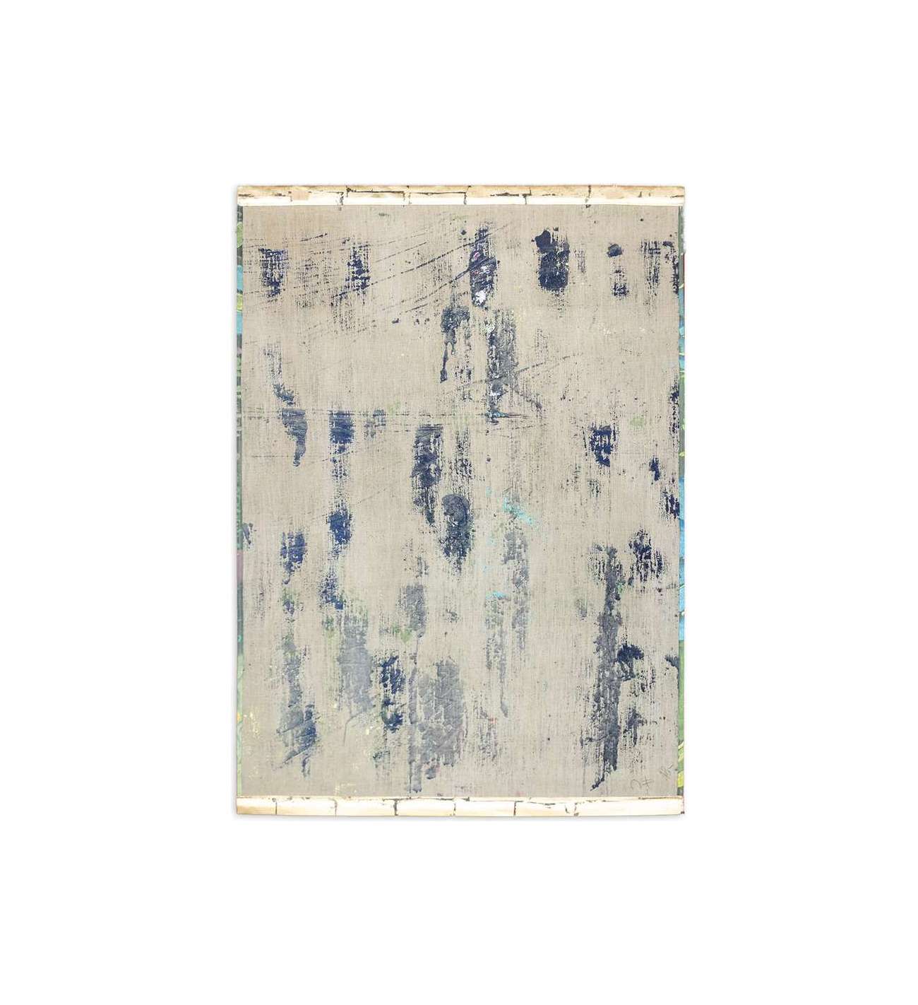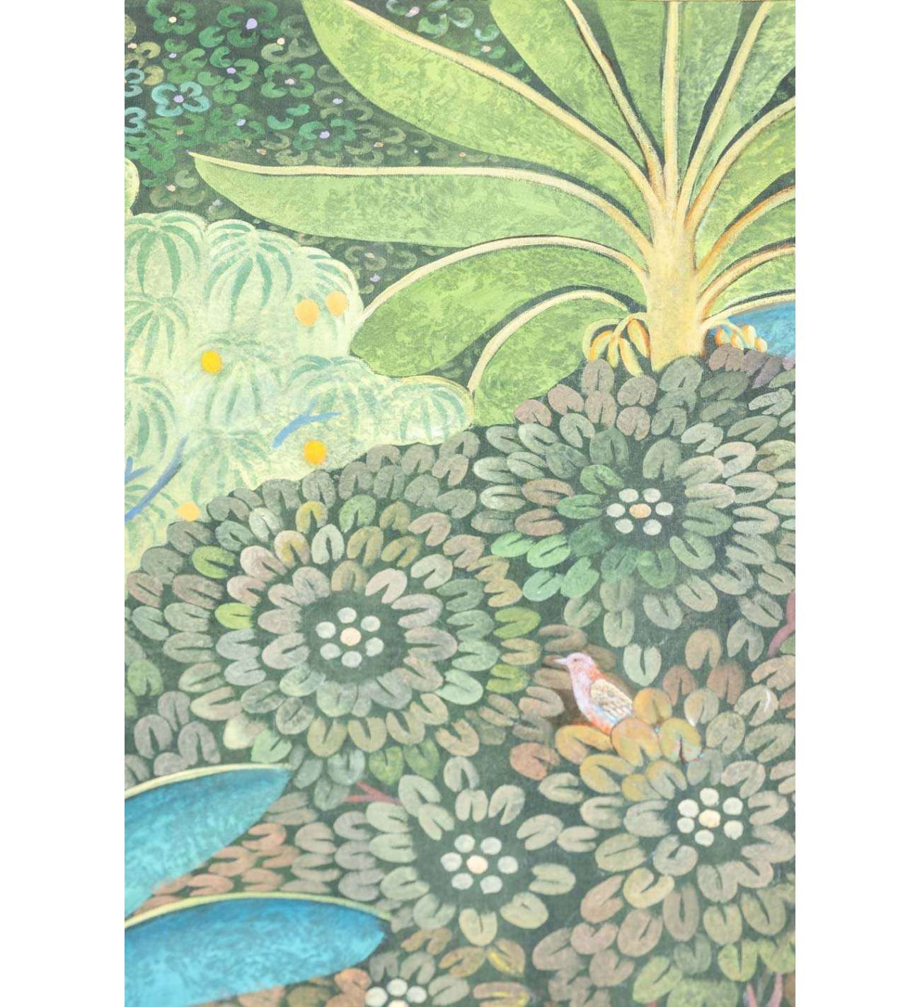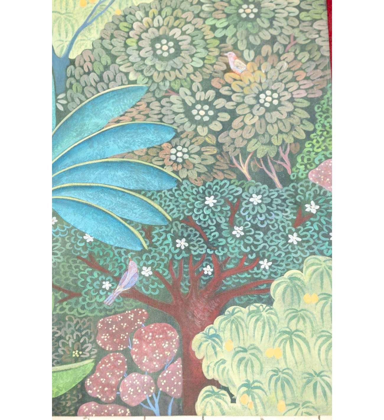 Toile brute en lin peinte à la main avec des pigments naturels et motifs dorés réalisés à la feuille de cuivre. Toile tendue à l’aide de deux baguettes en bois dont celle du bas est amovible, permettant de la rouler pour le transport.