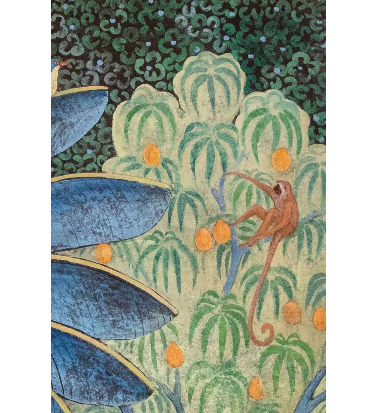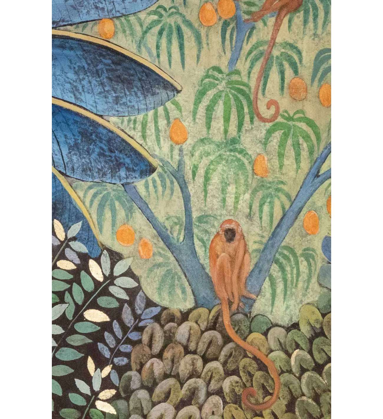 Il n'y a plus d'articles dans votre panierToile peinte représentant des singes sur un arbre fruitier et un oiseau sur la feuille d’un palmier stylisé de couleur bleue.